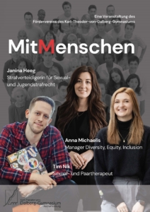 Im Rahmen der Jubiläumsfeierlichkeiten unserer Schule veranstaltet der Förderverein für die 11. Klassen am Freitag, den 25.7.2025, eine Podiumsdiskussion mit Workshops. Thema der Veranstaltung: MitMenschen.