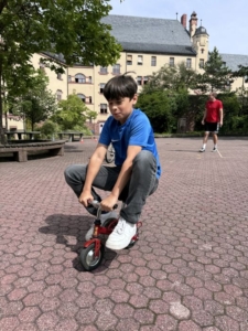 Beim "Spaß-Parcours" der Pedalwelt aus Heimbuchenthal konnten die Schülerinnen und Schüler der Unterstufe am Donnerstag, dem 18. Juli, die verrücktesten Fahrräder ausprobieren. Dabei gab es unterschiedlich große Reifen, verschiedene Sitzpositionen, sich bewegende Sattel, ... Die Teile der Räder waren schräg zueinander montiert oder durch ein Gelenk in sich beweglich, ...