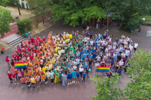 JA, DALBERG IST BUNT! Zum Beweis dafür, dass unsere Schule bunt und vielfältig ist, hat sich die Schulfamilie des Dalberg-Gymnasiums kurz vor Unterrichtsschluss am Dienstag, 27.6.23 gekleidet in den Farben des Regenbogens als lebende Pride-Fahne formatiert.