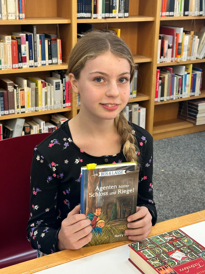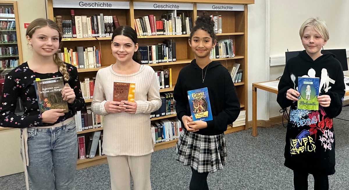 Eine Mutprobe, bei der ein Junge auf ein Dach klettern muss; Drachen, die eine unheimliche Gegend erkunden; eine chaotische Szene im Bus und ein Mädchen, das Gedanken lesen kann – mit diesen Textausschnitten erfreuten die vier Klassensiegerinnen Pauline, Franziska, Dior-Maria und Marla ihre Zuhörerschaft und die Jury beim diesjährigen Lesewettstreit in unserer schönen Bibliothek.