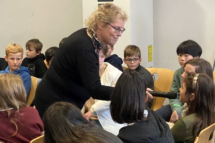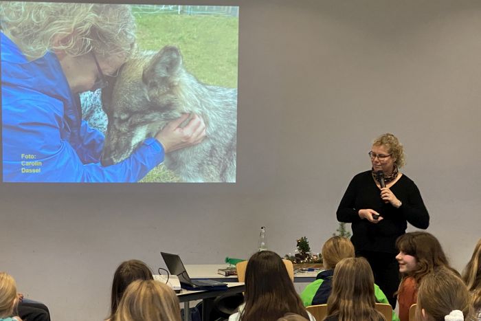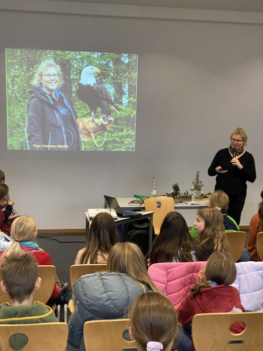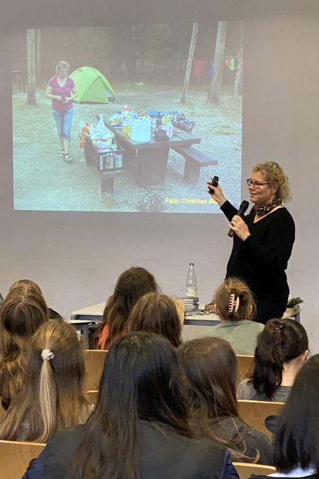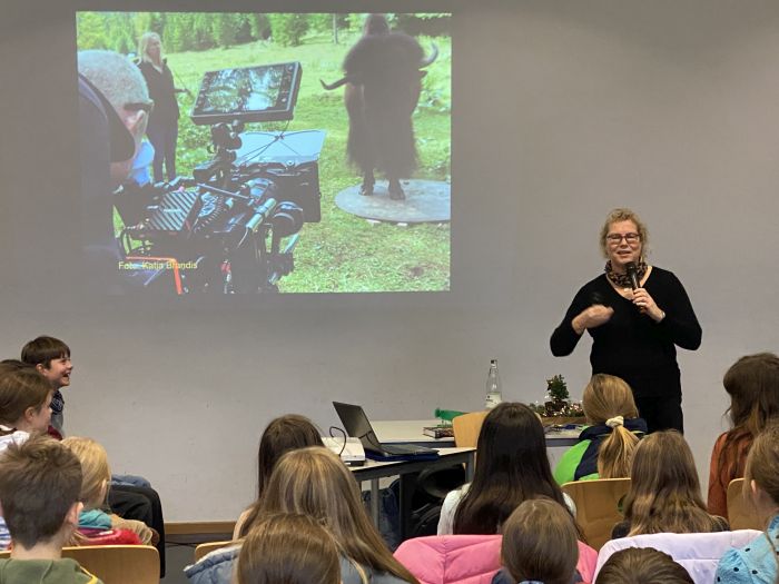 Die Schriftstellerin berichtete von Erlebnissen mit Tieren im Yellowstone Nationalpark, in Tierparks und bei Safaris in Namibia. Unter Mithilfe von Schüler*innen wurde schauspielerisch das richtige Verhalten im Umgang mit Bären, Pumas und Bisons erprobt. Und am Beispiel des Breitmaulnashorns wurde auch auf den Aspekt des Tier- und Artenschutzes hingewiesen. Diese Tiere sind bedroht, weil astronomische Summen für ihr Horn geboten werden.