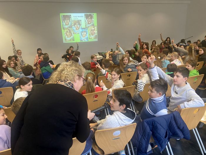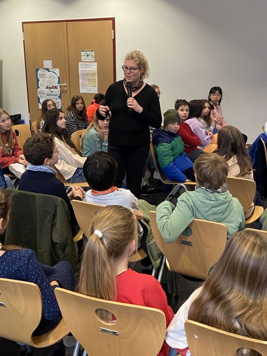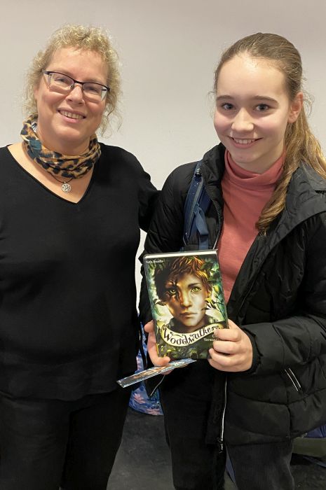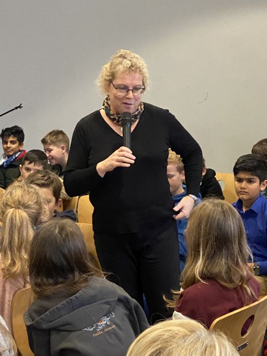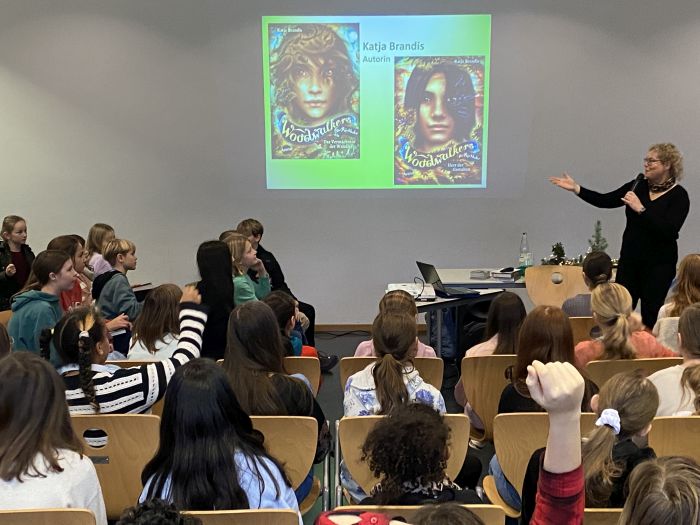Am Freitag, dem 8. Dezember kam Katja Brandis zu uns an die Schule und las den Schüler*innen der 5. und 6. Jahrgangsstufe aus ihren neuen Bänden der „Woodwalkers“-Reihe vor. Dazu wählte sie zunächst die Szene, als das Pumawandler-Mädchen Mia beim Friseur ist und sich in ihrer Menschengestalt das erste Mal die „Mähne“ schneiden lassen muss. Das amüsierte die Zuhörer sehr. Dann gab es sogar eine echte Weltpremiere: Frau Brandis las zum ersten Mal vor Publikum aus dem im Januar 2024 erscheinenden vierten Band („Der Club der Fabeltiere“) von „Woodwalkers. Die Rückkehr“ vor. So genannte „Triple-Wandler“ gefährden die Gemeinschaft der Tierwandler dadurch, dass sie spektakuläre Verwandlungen zu Fabelwesen wie Einhörnern, Drachen, Kentauren, Vampiren und Feen in den sozialen Medien zeigen.