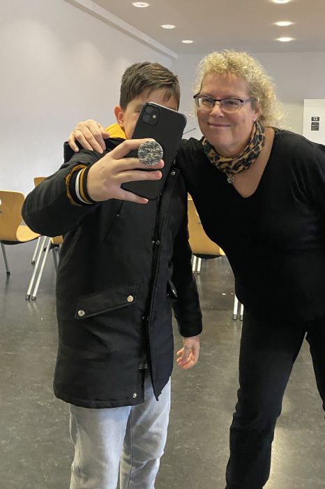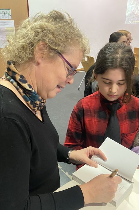 Bevor die Schüler*innen die Veranstaltung verließen, erhielten alle noch signierte Autogrammkarten, und Frau Brandis schrieb jedem, der ein Buch mitgebracht oder gekauft hatte, eine persönliche Widmung in sein Exemplar. Und natürlich durften auch die obligatorischen Selfies mit der Bestsellerautorin gemacht werden.