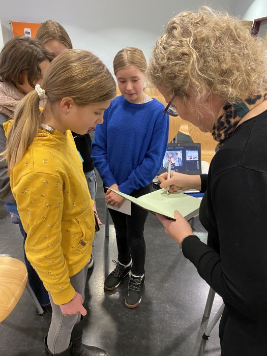 Nach der Lektüre gab Frau Brandis den interessierten Zuhörern Tipps für das Schreiben eigener Texte. Viele Fünft- und Sechsklässlerinnen hatten zuvor angegeben, selbst an diversen Geschichten zu schreiben. Die Autorin selbst beginne meist mit dem Entwerfen der Figuren, ihren Eigenschaften, Interessen und Lebensumständen. Außerdem sei für ihre Tierwandlergeschichten die Recherche über die Tiere und ihren Lebensraum besonders wichtig. Dann müsse die Handlung entworfen werden und schließlich müsse an der Sprache gefeilt und die Rechtschreibung korrigiert werden.