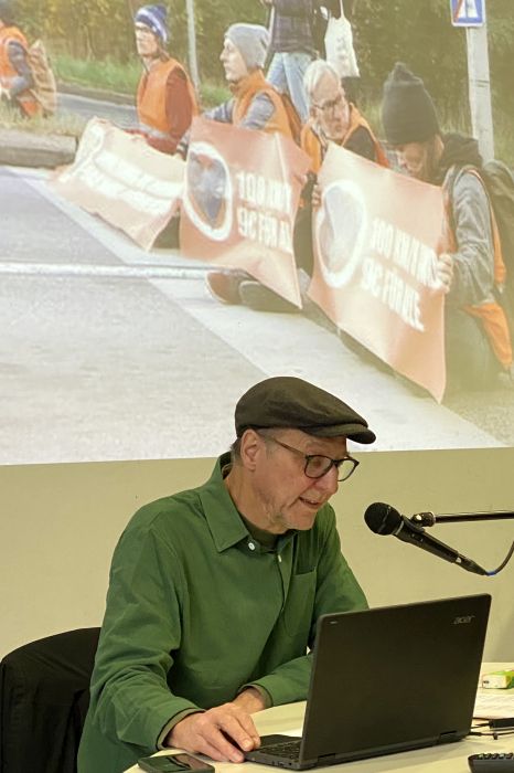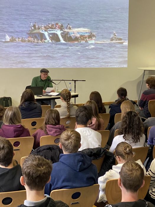 In seinen Texten beschäftigt sich Gsella aber auch augenzwinkernd mit dem ganz normalen Leben, zum Beispiel mit dem Älterwerden und dem Blick auf die junge Generation, der man selbst einmal angehörte. Er prangert aber auch negative Entwicklungen und Ungerechtigkeiten an. So beschäftigt er sich in einem Text damit, dass die Begriffe „Arbeitgeber“ und „Arbeitnehmer“ eigentlich falsch seinen, weil der Arbeitnehmer die Arbeit gebe und sie der Arbeitgeber nehme. Bei „Mission Lifeline“ veröffentlicht Gsella regelmäßig Gedichte, die sich kritisch mit aktuellen Themen auseinandersetzen, so auch mit dem Thema „Flucht“. Das Gedicht „Töte mich, Mama“, das auch in seinem Gedichtband „ICH ZAHL’S EUCH REIM“ erschienen ist, zeigt auf beeindruckende Weise Mitgefühl für geflüchtete Menschen. Einen großen Teil seines Vortrags widmete Gsella dem Thema „Verkehr“. Und bei Gedichten über den Stellenwert des Autos in unserer Gesellschaft, über Kreuzfahrtschiffe und ein mögliches Tempolimit wurde den Zuhörer*innen klar, dass der Autor immer auch persönlich in seinen Texten „involviert“ ist. Besonders deutlich wurde das den Schüler*innen, als Gsella erzählte, dass er geliebte Familienangehörige durch einen von einem Raser provozierten Autounfall verloren habe.