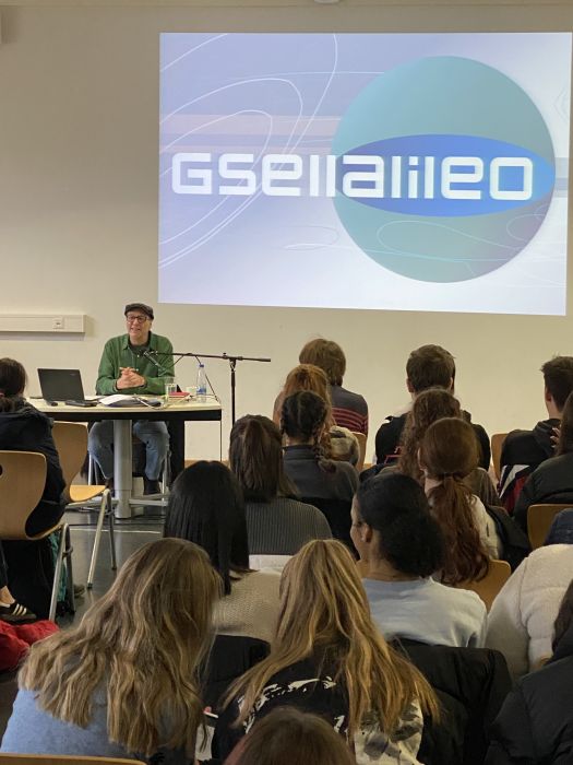 Über sein Leben und Schreiben kam der Autor mit den Schüler*innen ins Gespräch und beantwortete offen deren Fragen. Er berichtete von seiner Arbeit im „Homeoffice“ und gab Tipps, wie man Gedichte schreiben und dann überarbeiten und verbessern kann. Zu den Voraussetzungen guter eigener Texte gehöre auch das Lesen anderer Werke, wobei er sich jedoch in einem seiner Gedichte dagegen wehrt, von seinen Kollegen deren Texte zur kritischen Lektüre zugeschickt zu bekommen. Gsella schreibt für verschiedenste Medien. Regelmäßig erscheinenen seine Reimkolumnen im „stern“, im Schweizer „Das Magazin“ und der Zeitschrift „konkret“. Zum Beispiel für die „Titanic“, deren Chefredakteur Gsella lange Jahre war, schreibt er unter der Rubrik „Gsellalileo“ auch Prosatexte, von denen er auch einige den Schüler*innen des Dalberg-Gymnasium vorstellte.