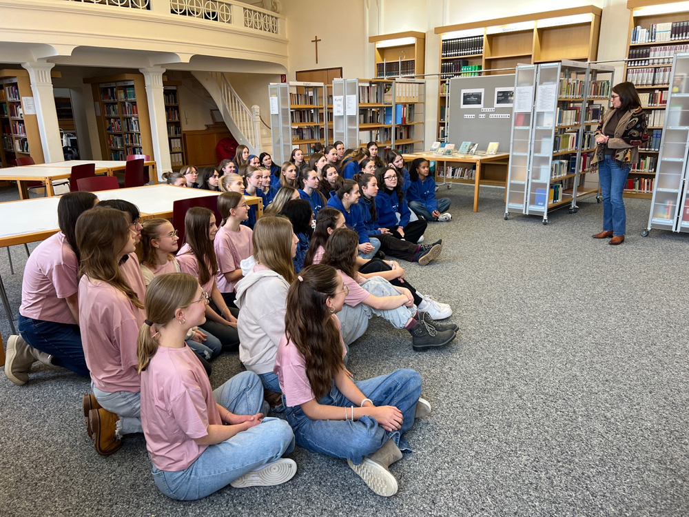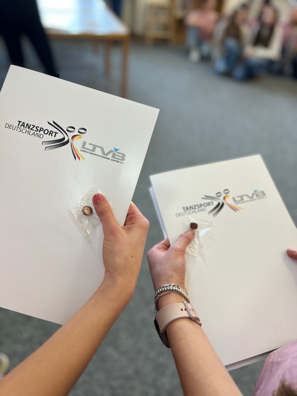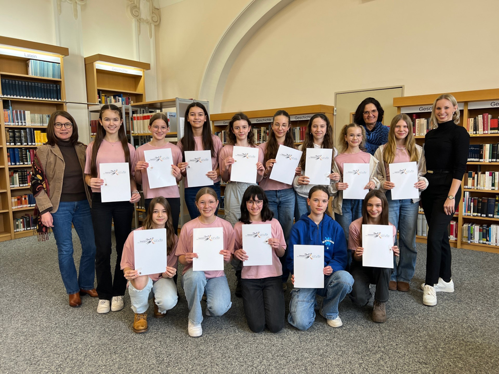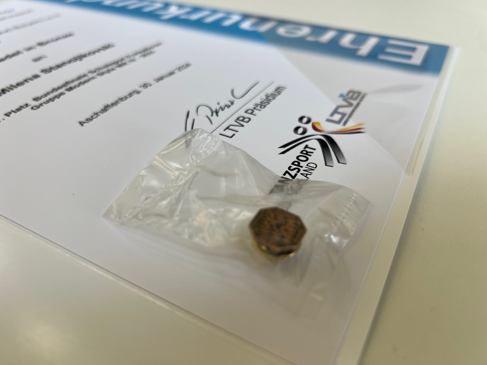 Frau Lea Baier als Vertreterin des Landestanzsportverbands Bayern e.V. war eigens aus Nürnberg angereist: Sie gratulierte unseren Wettkampfgruppen persönlich zur Deutschen Meisterschaft im Tanzsport Formation Modern Style im Schulsport 2023 und überreichte jeder Tänzerin eine Urkunde des Verbandes. Sie freut sich sehr, Christine Fischer als Trainerin und allen Tänzerinnen für den herausragenden Erfolg die Ehrennadel des Verbandes in Bronze verleihen zu dürfen. Dies ist die höchste Auszeichnung, die im Schulsport erreicht werden kann.
