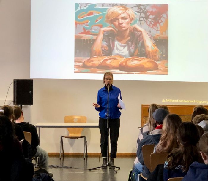 Im Dezember konnten die Klassen der 9. Jahrgangsstufe einen inspirierenden Vortrag von Pauline Füg genießen. Die unter anderem mit dem Kulturpreis Bayern ausgezeichnete Künstlerin präsentierte Verse zu verschiedenen Themen, wie z.B. eine Liebeserklärung für ihren Lieblingsdetektiv Justus Jonas aus der Jugendbuchserie „Die drei ???“ oder den nachdenklich machenden Text „Sie sagen Brot“ über gesellschaftliche Erwartungshaltungen und Frauenbilder. Neben dem Einblick in ihre künstlerische Arbeit war es v.a. spannend zu erfahren, welche Gedanken und Experimente Frau Füg mit KI macht. Sie diskutierte mit dem Publikum beispielsweise über die Bilder, die sie von KI zur Illustration ihrer Verse erstellen ließ. Außerdem las sie kontrastierend eigene Werke und von KI verfasste vor.