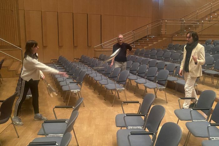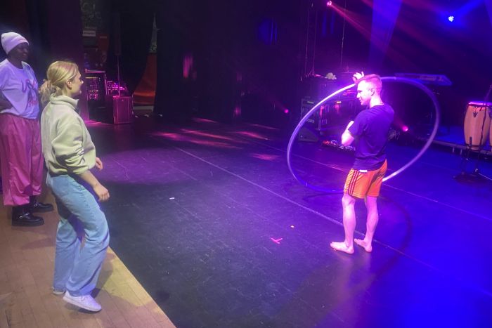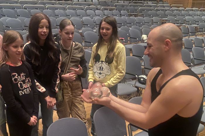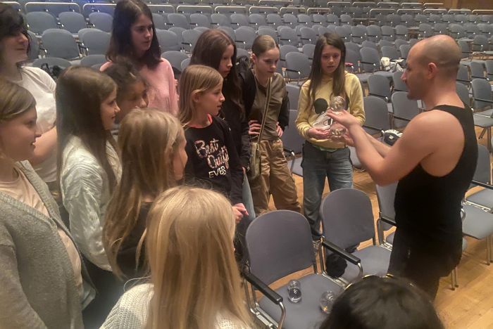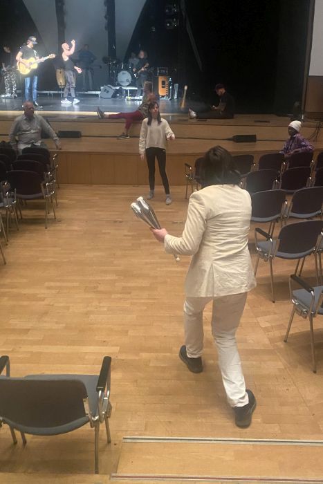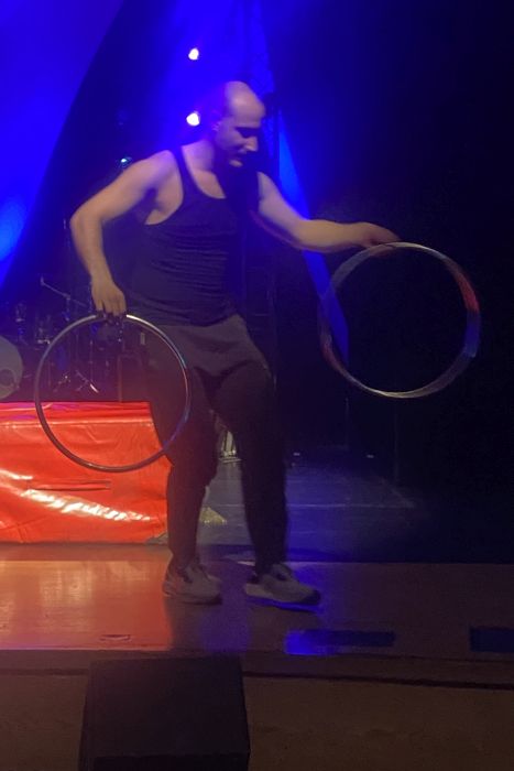Während der Proben kam es zudem zu einem ganz engen Kontakt mit den Künstlern. Simone Al Ani, der eigentlich Straßenkünstler ist und nun bei seiner ersten großen Show auftrat, zeigte den Schülern „zum Anfassen“ seine bezaubernde Jonglage mit Kristallkugeln und Ringen, in denen die Objekte zunehmend ihr eigenes Leben erhalten. Es leitete die Schüler bei Fingerübungen an, bei denen sie unter anderem Tiere mit den Händen bildeten. Diese Anleitung funktionierte ohne Worte. Da war es nur logisch, dass auch eine kleine Einführung in die Pantomime folgte. Und zuletzt demonstrierte er „auf Tuchfühlung“ verblüffende Zaubertricks, bei denen er Gegenstände verschwinden und wieder erscheinen ließ. Victor Krachinov unterstützte Schülerinnen bei den ersten Schritten zum „Passing“ mit Keulen und bei der Jonglage mit Bällen. Verblüffend war, wie leicht seine selbst hergestellten Bälle waren. Das erklärte der Künstler damit, dass sonst bei der Jonglage mit bis zu neun Bällen der Muskelkater vorprogrammiert ist. Unser Interesse wurde auch von einem besonderen Zirkusgerät geweckt, dem Cyr-Rad. Dieses Gerät durften einige Teilnehmer des Dalberg-Gymnasiums im letzten Jahr bei einem Besuch der Show „Lucia“ des Cirque du Soleil in Frankfurt gemeinsam mit ihren Familien bewundern, bei der die Deutsche Lea Toran Jenner poetische Akrobatik im Cyr zeigte. Vor acht Jahren wurden die Bewegungskünstler auch schon einmal bei einem der regelmäßig stattfindenden Zirkusworkshops ins Turnen mit diesem Gerät eingeführt. Dieses Mal durfte wegen der schnellen Taktung bei der Stellprobe auf der Bühne zumindest Frau Gold einmal das Cyr-Rad in die Handnehmen und ausprobieren.