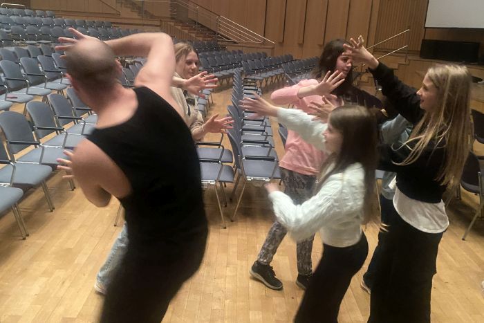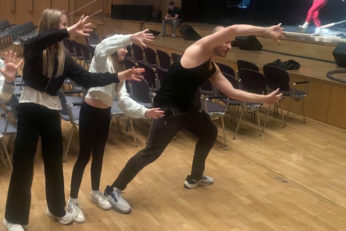 Wir entschieden uns also schnell, verschiedene akrobatische Figuren einzubringen und begannen gleich mit den Proben. Auf der Bühne sollte ja alles klappen und schön aussehen. Deswegen war es wichtig, gewisse Abläufe zu klären, Sicherheitsaspekte zu beachten und die optisch ansprechende Aufteilung auf der Bühne zu klären. Für die Fünftklässler war es schließlich der erste „große“ Bewegungskünste-Auftritt auf solch einer Bühne.