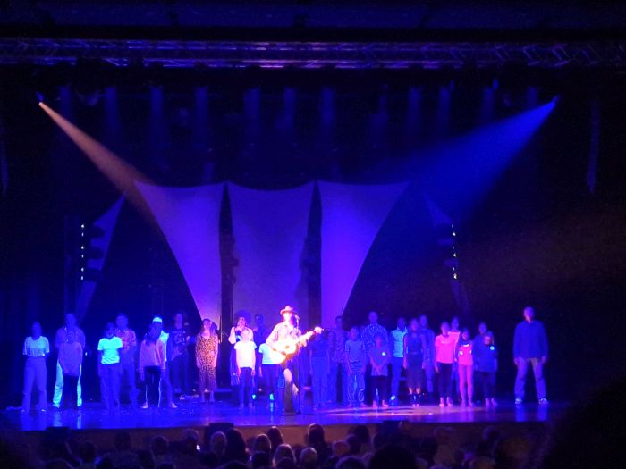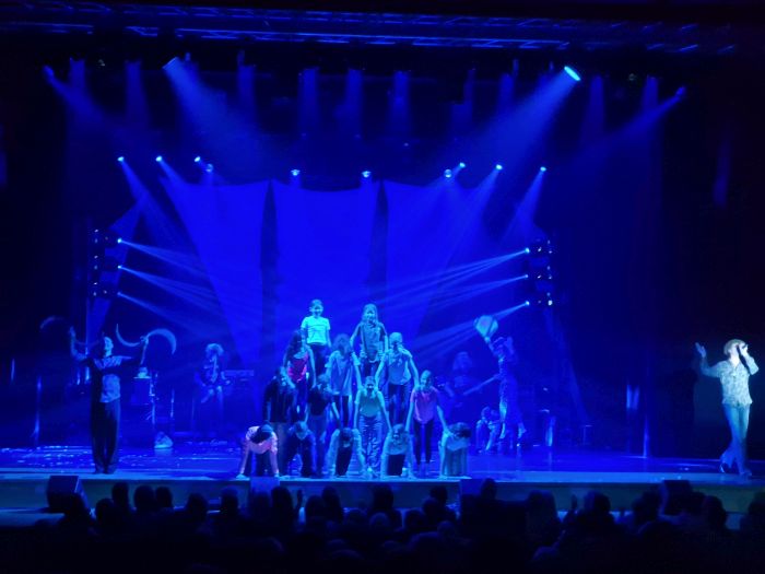 Als dann nach dem ersten Vorhang gegen Ende der Vorstellung „My Generation“ von „The Who“ angestimmt wurde, lud Sänger Max die neue Generation von Zirkuskünstlern, die Bewegungskünstler des Dalberg-Gymnasiums, zu sich. Diese sprangen sofort auf und stürmten barfuß durch die Reihen nach vorne auf die Bühne. Dort zeigten sie zunächst eine große Pyramide aus 14 Personen und dann verschiedene selbst festgelegte gruppen- und partnerakrobatische Figuren wie Flieger, Stuhl und Schulterstand. Bei der Vorstellung der Beteiligten an der Show saßen die Dalberger am Bühnenrand und nahmen so eine Position zwischen dem begeisterten und applaudierenden Publikum und den beglückten und stolzen Künstlern ein. Es folgte eine kurze LED-Show, bei der sich Jule mit ihren Leuchtpois beteiligen durfte. Beim Schlussbild wurden wir ebenfalls integriert. Zu Bob Dylans Protestsong „The Times They Are A-Changin'“ stellten sich zunächst alle mit dem Rücken zum Publikum auf die Bühne und wendeten sich dann in Gruppen zu diesem um. In dem Lied wird die Generation, die aktuell die Entscheidungen trifft und die Geschicke der Welt lenkt, dazu aufgerufen, sich der Jugend und ihren Ideen zu öffnen. Da war es eine passende Idee, unsere Jüngsten unter den Bewegungskünstlern einzubauen und quasi zu ihren eigenen Eltern sprechen zu lassen. Zum Schluss durften auch wir Dalberger den Applaus des Publikum genießen. Mit dem fallenden Vorhang wurden wir in die Gemeinschaft der Artisten aufgenommen, mit denen gemeinsam wir dann direkt hinter den Kulissen ein gemeinsames Foto machen durften.