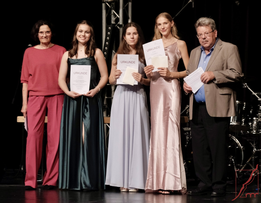 Christine Fischer und Richard Keller vom Förderverein zeichneten hervorragende Seminararbeiten aus und überreichten Urkunden und Geldpreise an Karolina, Anna und Eva: