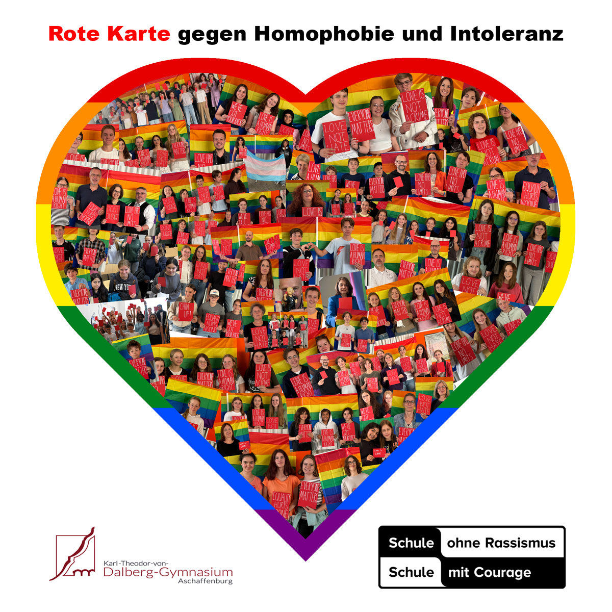 Wir verstehen unsere Schule als einen Safe Space und einen bunten Ort, an dem Diversität, Toleranz und Akzeptanz willkommen sind und haben deswegen anlässlich des Pride Month Juni wieder ein sichtbares Zeichen für die Gleichberechtigung aller Menschen nach dem Motto „Love is Love“ gesetzt: die Mitglieder der Schulfamilie haben einzeln, in Gruppen der auch klassenweise der Homophobie und Intoleranz symbolisch die Rote Karte gezeigt und damit aktiv klargemacht, dass sie sich auch weiterhin dafür einsetzen werden, dass unsere Schule bunt bleibt und ein aktives Mitglied im Netzwerk „Schule ohne Rassismus – Schule mit Courage“ ist. Vielen Dank an alle fürs Mitmachen!