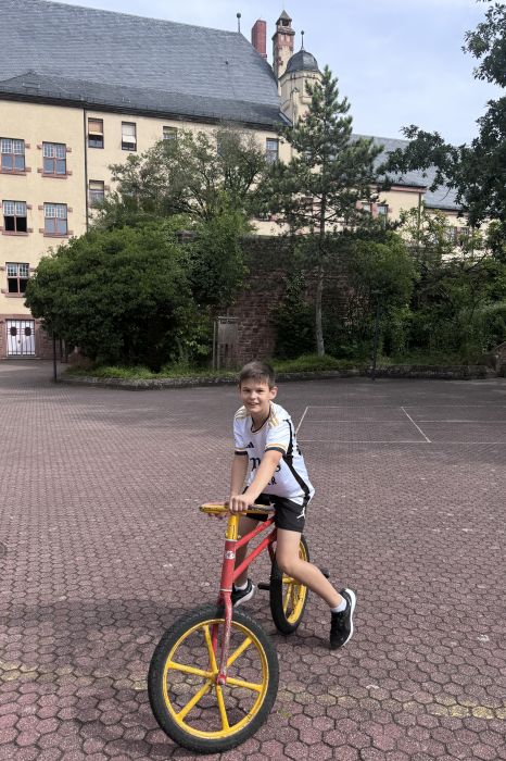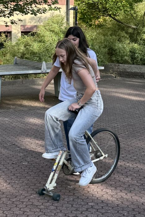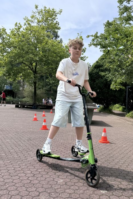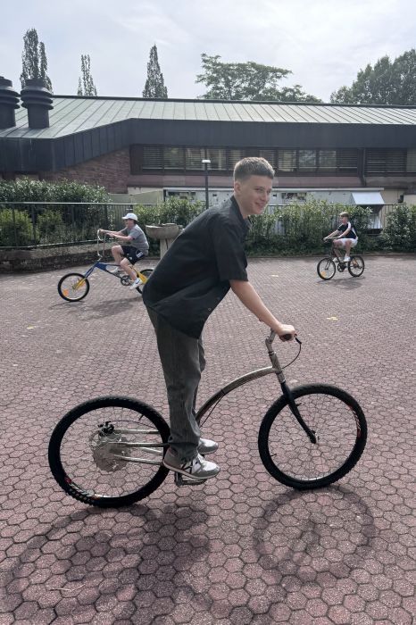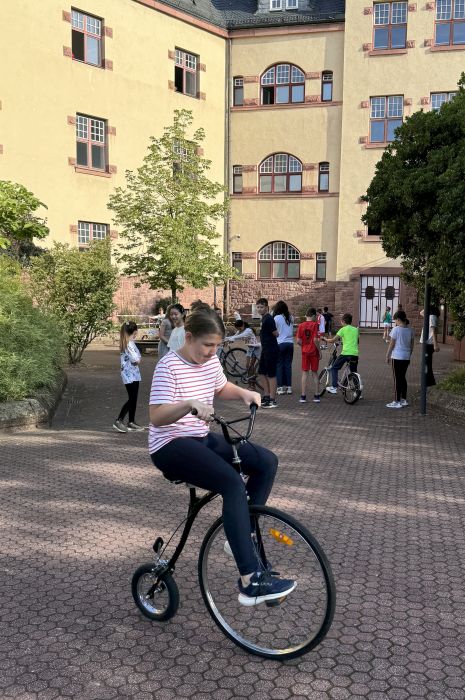 Beim „Spaß-Parcours“ der Pedalwelt aus Heimbuchenthal konnten die Schülerinnen und Schüler der Unterstufe am Donnerstag, dem 18. Juli, die verrücktesten Fahrräder ausprobieren. Dabei gab es unterschiedlich große Reifen, verschiedene Sitzpositionen, sich bewegende Sattel, … Die Teile der Räder waren schräg zueinander montiert oder durch ein Gelenk in sich beweglich, … Es machte großen Spaß, diese unterschiedlichen Gefährte auszuprobieren. Und nach kurzer Zeit meisterten die Schülerinnen und Schüler nahezu alle Aufgaben. Nur auf einem Fahrrad konnte keiner fahren: das Fahrrad, das bei jeder Lenkbewegung in die entgegengesetzte Richtung fuhr. Das hatten aber auch Joko und Claas in ihrer Fernsehshow nicht geschafft!