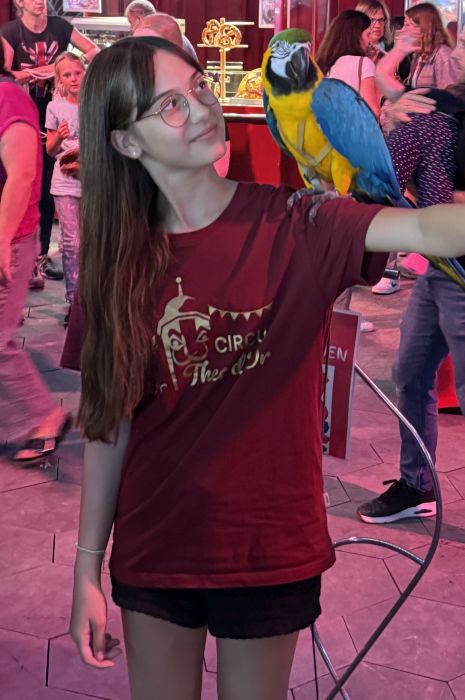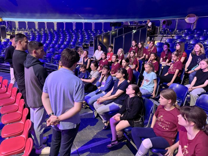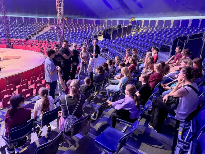 Außerdem war Veronika Ernesto gekommen, die gleich zu Beginn der Show spritzige Akrobatik im Wasser einer „Fishbowl“ und hoch oben in den Lüften am „Aerial Ring“ zeigen sollte. Sie erzählte uns viel vom Alltag eines Zirkuslebens. Interessant war zum Beispiel, dass die Artisten in verschiedenen Zirkussen aktiv sind, meist drei verschiedenen pro Jahr. Und sie selbst hat innerhalb der Zirkusvorstellung auch verschiedene Nummern, teils alleine, teils mit ihrem Mann. Ihr vierzehnjähriger Sohn gab uns einen Einblick in die Aufgaben eines Heranwachsenden beim Zirkus. Seine Schule absolviert er online. Zusätzlich muss er natürlich auch mit anpacken. In der Pause begegnete er uns zum Beispiel beim Verkauf von Programmheften. Viele Artisten sind also mit ihrer ganzen Familie im Einsatz. Dimitri Stauberti beleuchtete auch die weniger angenehmen Seiten des Lebens als Artist. Da können einem schon auch einmal die Muskeln weh tun. Beim Bestaunen seiner Nummer gemeinsam mit seiner Frau konnten wir das sehr gut nachvollziehen. Das Ehepaar zählt zu den leistungsstärksten Artisten der Welt. Nur wenige wagen sich an das extrem schwierige, gefährliche und kräftezehrende Genre der Perche-Artistik. Für diese unvergleichbare Performance erhielten die beiden Prager Artisten auf dem „42. Internationalen Circusfestival von Monte Carlo“ im Jahr 2018 den Silbernen Clown. Einige unserer Schülerinnen können zwar auf dem Hocheinrad fahren, dabei aber nicht auf dem Kopf noch eine zweite Person auf einer Stange balancieren. Auch Lorenzo Bernardi, der begnadete Kontorsionist, stand uns Rede und Antwort. Er machte uns deutlich, dass man häufig sehr jung mit seiner Art der Artistik beginnen und ständig im Training bleiben muss. Vor seiner Vorstellung muss er sich eine Stunde lang aufwärmen. Michael Cadima komplettierte die Gruppe. Seine Familie ist seit sieben Generationen beim Zirkus. Wir durften ihn als Clown bewundern. Zuvor machte er uns deutlich, wie wichtig bei seinen Nummern das Timing ist, dass man jedoch auch sehr spontan reagieren und auf das Publikum eingehen muss. Insgesamt bekamen wir einen sehr guten Einblick „hinter die Kulissen“ eines Zirkus und freuten uns sehr über den regen und freundlichen Austausch mit den Zirkuskünstlern aus verschiedensten Nationen.