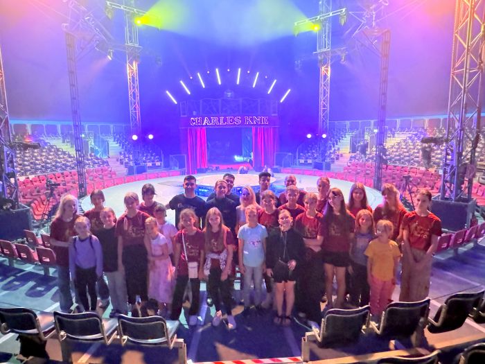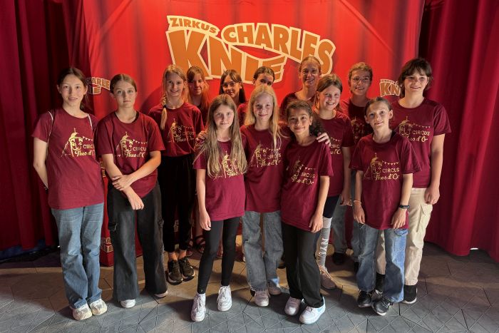 Zum Abschluss dieses Schuljahres gingen 18 Mitglieder des „Circus Theo d’Or“ gemeinsam mit ihren Eltern, Geschwistern und einigen Lehrern in die Aschaffenbugr-Premiere der Show „100.000 Liter Emotionen“ des Zirkus Charles Knie. Ihre eigene Show im Stadttheater hatten die Zirkuskünstler des Dalberg-Gymnasiums damit begonnen, dass Theodor, ein erfolgloser Zauberer, den Schweizer Nationalzirkus der Gebrüder Knie verlässt. Nun kehrten die Darsteller in die Manege derselben Zirkusdynastie zurück. Mittlerweile wird der Zirkus Charles Knie jedoch von einer anderen Familie geführt, deren Sohn unsere Gruppe von insgesamt 56 Personen vor dem eigentlichen Einlass ins Zirkuszelt einlud und uns über die Zirkuswelt informierte.