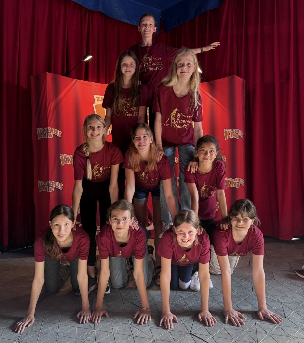 Die Zirkuswelt ist äußerst bunt. Das zeigte sich bei der Show „100.000 Liter Emotionen“ schon allein durch die farbenfrohen Kostüme. Die verschiedenen Darbietungen waren wunderschön inszeniert. Den Zuschauern standen bei den hochklassigen Acts die Münder offen und sie wurden von den schwungvollen Beträgen mitgerissen. Die Mitglieder des Circus Theo d’Or fanden zwar immer auch kleine Tricks, die sie bei der Jonglage, beim Poi-Swinging oder beim Turnen an Luftring und Vertikaltuch selbst beherrschten. Die Fertigkeiten der professionellen Artisten gingen aber weit über die eigenen hinaus und begeisterten den „Zirkusnachwuchs“. Schön war es dann auch, dass beim Finale Veronika und Michael noch einmal im Kostüm direkt zu unserer Gruppe kamen. Es waren wirklich „Artisten zum Anfassen“!
