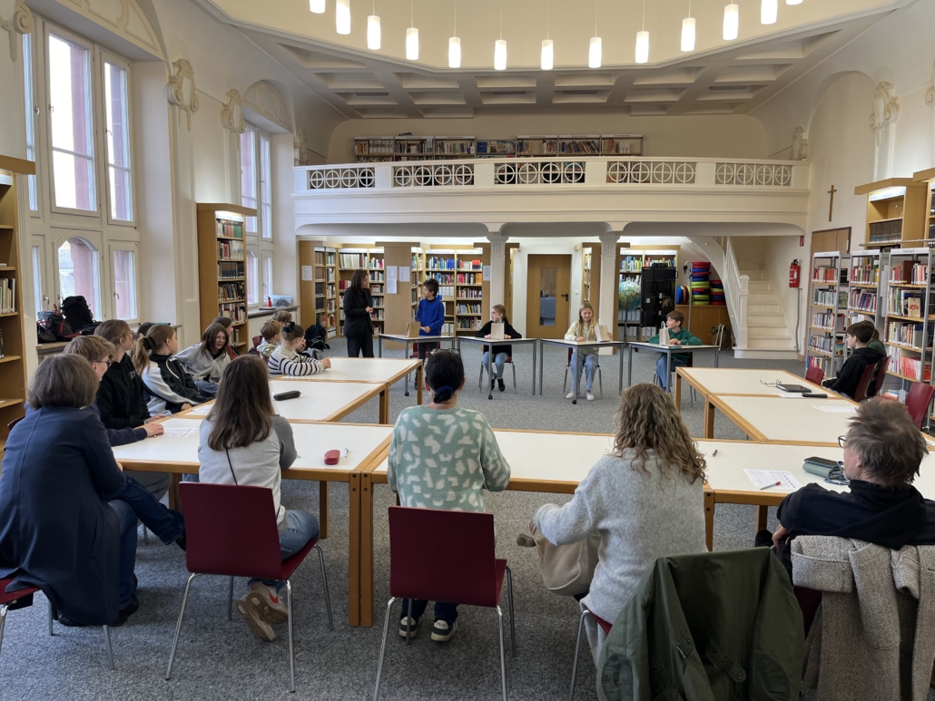 Der Vorlesewettbewerb ist eine schöne Tradition an unserer Schule. Die sechsten Klassen ermitteln zunächst einen Klassensieger, bevor das Finale unter den strengen Augen der Lehrerinnen, Eltern und Schülersprecherinnen in der Bibliothek stattfindet. Dabei lesen die Kinder zunächst aus einem selbstgewählten Buch vor, bevor sie in der zweiten Runde in der Königsdisziplin des Vorlesens antreten: Dem lauten Lesen eines völlig unbekannten Textes. Hierfür wurde diesmal „Der Tanz der Tiefseequalle“ von Stephanie Höfler ausgewählt.