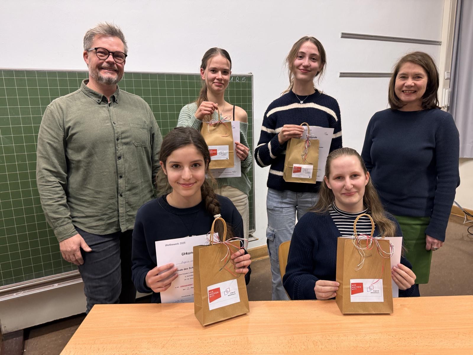 Mit Fairness, gutem Zuhören und fundierten Argumenten debattierten sich in beiden Altersgruppen jeweils vier Schülerinnen und Schüler ins Finale. Nach insgesamt drei Debattenrunden und der tatkräftigen Mithilfe von Schüler- und Lehrerjuroren standen um 17 Uhr die Siegerinnen und Siegerdes Wettkampfs fest und wurden mit einer Urkunde und einem Preis durch Schulleitung und Elternbeirat belohnt.