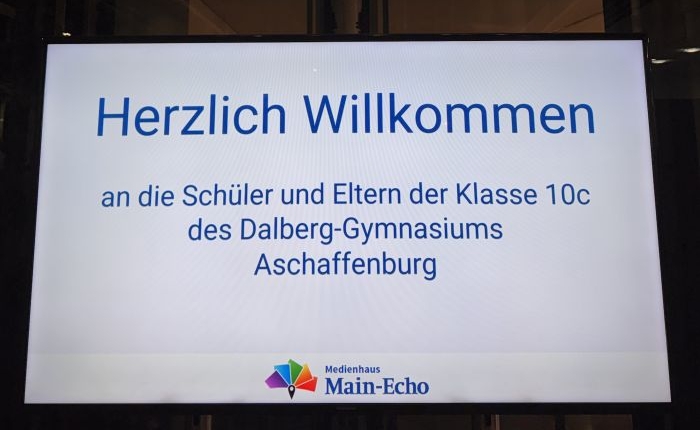 Am Donnerstag, dem 23. Januar 2025, besuchten die Schülerinnen und Schüler der Klasse 10c gemeinsam mit ihren Eltern und Geschwistern zu später Stunde das Medienhaus Main-Echo. Zunächst stellte uns Herr Ulrich Eymann, der Geschäftsführer selbst, sein Haus vor, dass sich als einer der wenigen Verlage in Deutschland seit Beginn seines Bestehens (1945) in Familienhand befindet. Dabei wurde schnell deutlich, dass sein Unternehmen nicht nur Printmedien, sondern auch zahlreiche digitale Medien unterhält. Der stellvertretende Chefredakteur Stefan Reis, den die Klasse aus gemeinsamen Deutschstunden kannte, erläuterte dann die Aufgaben der Journalisten und konkretisierte diese an den Vorgängen in der Redaktion am Tag zuvor, der durch die Vorfälle im Park Schöntal für Aschaffenburg ein besonders schwieriger gewesen war. Schließlich stellten die beiden „Zeitungsmacher“ sich den Fragen der jungen und älteren Gäste und gingen dabei auch auf politische Einflussnahme in den Medien und die Ethik bei der Berichterstattung ein. Dieser Austausch wurde dann noch bei Gesprächen während des kleinen Imbisses in der Cafeteria weitergeführt.