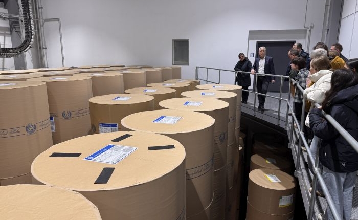 Dann ging es in zwei Gruppen auf zur Führung durch die Druckerei. Zunächst wurden die tonnenschweren Papierrollen bewundert, auf denen sich jeweils über 20 Kilometer Zeitungspapier befindet. Nach einer kurzen Erklärung des Offset-Druckverfahrens ging es dann zur Presse, die kurz zuvor angelaufen war und in unglaublicher, für das Auge nicht zu verfolgender Geschwindigkeit die Zeitung des nächsten Tages druckte. Die Teilnehmerinnen und Teilnehmer an der Führung konnten beobachten, wie die Druckplatten ausgetauscht wurden, die Presse erneut anlief und das Druckbild von den Mitarbeitern kontrolliert wurde, bevor die fertigen Zeitungen über Bänder, wie an Wäscheleinen aufgehängt, in die nächste Halle transportiert wurden. Manch Vater stellte dabei interessierte Fragen zu den technischen Abläufen. Zum Schluss der Führung konnten wir noch sehen, wie die verschiedenen Zeitungen, je nach Verbreitungsgebiet, mit unterschiedlichen Beilagen versehen und dann für verschiedene Tranportwege vorbereitet wurden.