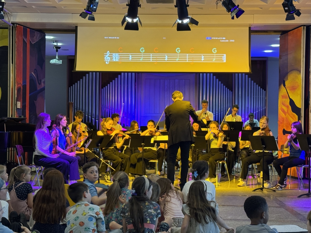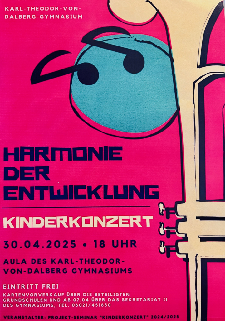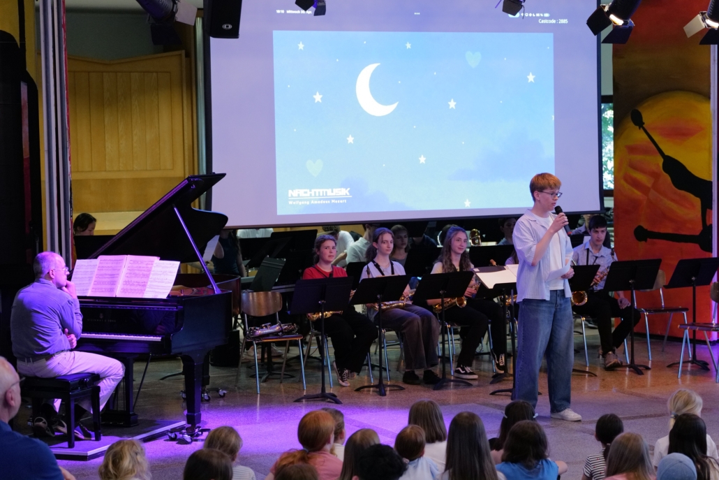 Den Auftakt eines wundervollen Abends bildete die Bigband des Dalberg Gymnasiums mit dem Titel „Wizard Wheezes“. Danach leiteten auch schon die Moderatoren des heutigen Abends, Timo Hartmann und Maya Wagner die spannende Zeitreise ein, welche die Kinder durch die Epochen der Musik führen würde. Beginnend bei Mozarts „Kleiner Nachtmusik“, gespielt von einem für das Konzert gegründetem Streichquintett, über den in der Romantik von Franz Liszt komponierten „Liebestraum“, musiziert von Herrn Antusch, bis hin zu Vivaldis „Frühling“ konnten die Kinder ihr Wissen unter Beweis stellen, indem sie jeden Titel auf Anhieb errieten. Auch die Mitmachbewegungen während dem Frühling ahmten die Kinder perfekt nach. Schließlich endete die kleine Zeitreise mit dem Bigband-Titel „Blues Brothers“, woran den Kindern das Improvisieren erklärt wurde. Hierbei konnten einige Kinder dem Improvisator Ruben Stripf Vorschläge machen, wie beispielsweise höhere oder schnellere Töne, die er gekonnt umsetzte und den Kindern ermöglichte, eine „eigene“ Improvisation zu komponieren. Puh, jetzt aber erstmal eine kurze Pause von dieser anstrengenden Zeitreise, in der man sich mit Kuchen und Getränken der Q12 stärken konnte.