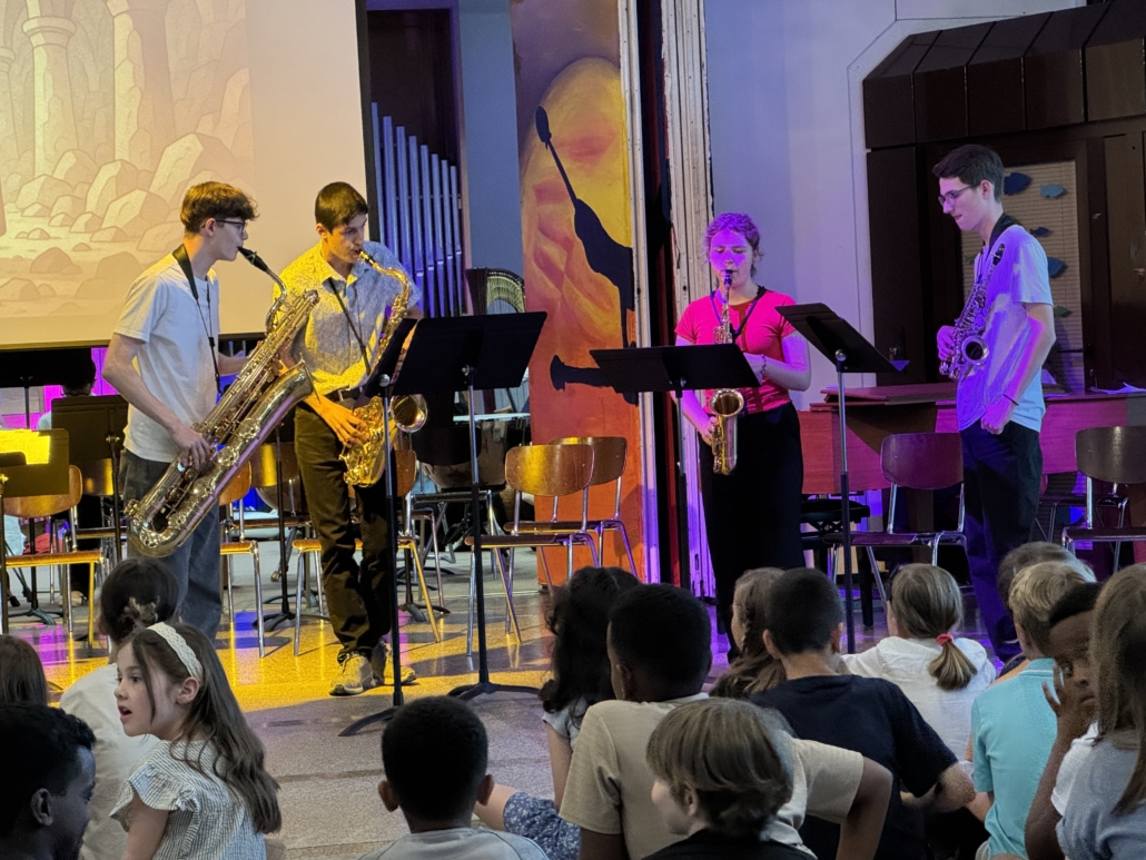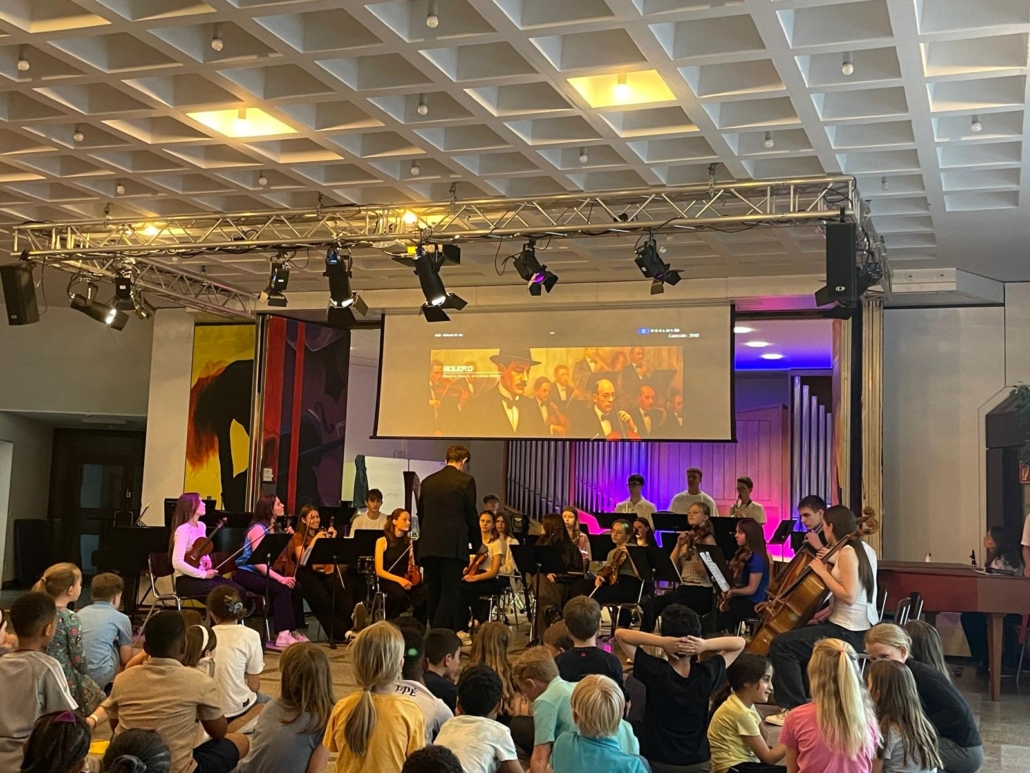Das Ende der Pause signalisierte Vitus Schott mit Trompetensignalen, die auch schon unsere ersten Grundschüler mit ihren einstudierten Stücken auf die Bühne baten. Den Anfang der zweiten Hälfte, die unter dem Überthema „Entwicklung innerhalb der Musik stand, bildete die Grünewald-Grundschule und die 5a des Dalberg-Gymnasiums, die das Stück „It’s Good“ vortrugen. Einstudiert wurde dies mit Klangstäben, sogenannten „Boomwhackers“ und unterstützt von Vitus Schott, Timo Hartmann, Isabella Appel und Ruben Stripf, welche die Grundschüler*innen zweimal besuchten, um diesen wundervollen Auftritt vorzubereiten. Weiter ging es mit Maurice Ravels legendärem „Bolero“. Auch hier konnten sich Grundschüler*innen von der Kolping-Schule zusammen mit dem Projektorchester unter Beweis stellen und dieses Stück noch weiter mit einer „Bommwhackerbegleitung“ entwickeln. Dieser unvergessliche Auftritt wurde von Julian Melcher, Louis Eicker und Maya Wagner einstudiert. Wiederum anders steigerte sich die „Halle des Bergkönigs“ von Edvard Grieg, gespielt von dem Projekt-Saxophonquartett, bei dem die Kinder erst einmal den ganzen Tonumfang von den verschiedenen Saxophonen gezeigt bekamen. Beim Durchlauf begeisterte das Ensemble mit seinen rasanten Tempi. Darauffolgend wurde wiederrum die Bigband, unter der Leitung von Florian Richter, der auch dieses P-Seminar tatkräftig leitete, auf die Bühne gebeten. Anhand der Filmmusik „The Incredibles“ aus dem Animationsfilm wurde die Entwicklung eines Stückes anhand der unterschiedlichen Taktarten, 3/4, 4/4, und 5/4 erklärt, welche alle eine andere Betonung und Stimmung vermitteln. Als krönenden Abschluss des Konzerts durften nun auch die letzten Grundschüler*innen der Grundschule-Haibach die Bühne betreten. Einstudiert durch Elias Gerschütz, Mona Strichirsch und Timo Hartmann trugen diese den Kanon „Kookaburra“ am Ende sogar mit allen anderen Kindern und Eltern vor und sorgten dafür, dass dieser Abend unvergesslich wurde.