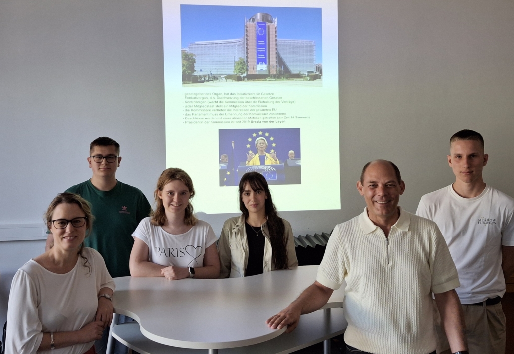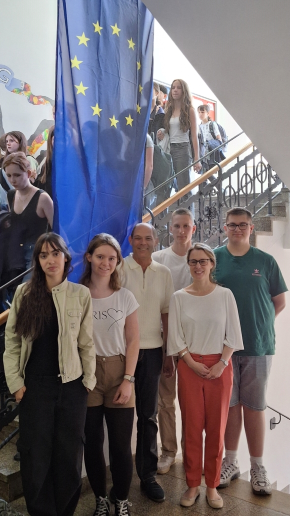 Am 2. Mai 2025, anlässlich des Europatages, hatte die 11. Jahrgangsstufe des Dalberg-Gymnasium die Gelegenheit, mit Sophie Trampf zu sprechen. Sie arbeitete bis 2019 für eine Europaabgeordnete und ist seitdem in der Generaldirektion Verkehr und Mobilität der Europäischen Kommission tätig. Als eine äußerst gut informierte Referentin konnte sie den Schülerinnen und Schülern spannende Einblicke in ihre Arbeit geben.