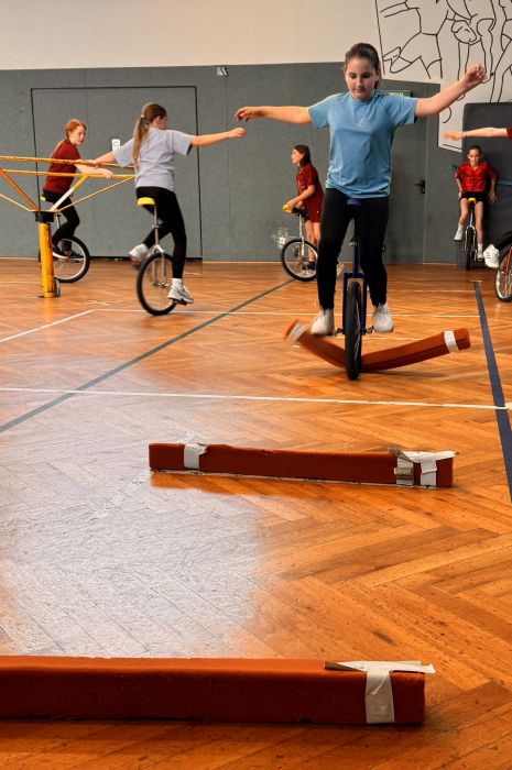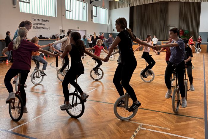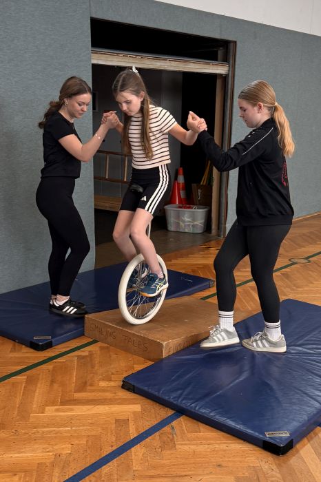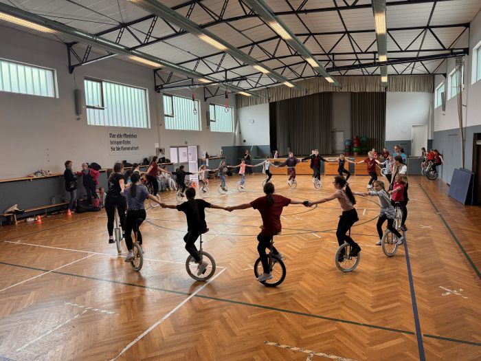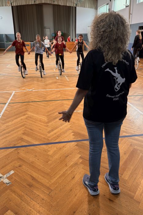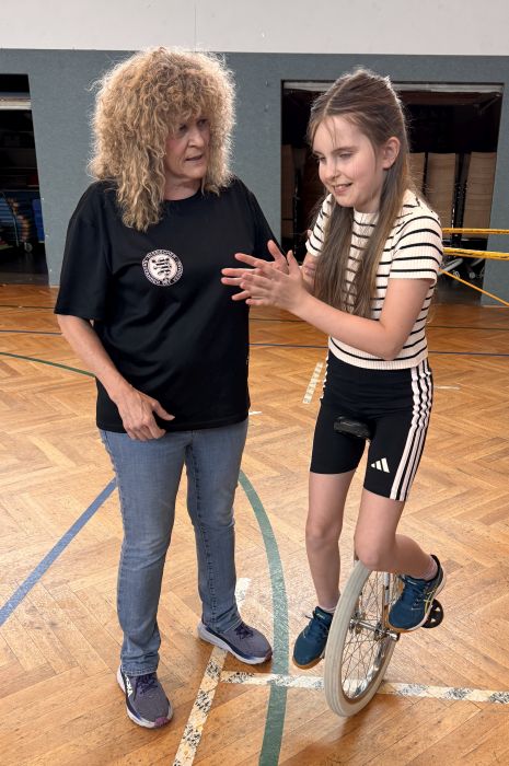Am Freitag, dem 23. Mai, waren die Bewegungskünstlerinnen des Circus Theo d’Or zu einem Einradtraining des TSV Dudenhofen eingeladen. Der Verein hat eine eigene Einradabteilung, die sich auf Einrad-Freestyle spezialisiert hat. Auf dem Einrad werden waghalsige Tricks gemacht. Die Sportlerinnen und Sportler fahren zum Beispiel mit nur einem Bein auf dem Pedal, und das teilweise überkreuz, haben die Hände statt der Füße auf den Pedalen, lassen den Sattel zu Boden fallen und fahren ohne Sattel weiter, liegen bäuchlings auf dem Sattel, hüpfen und drehen dabei das Einrad unter sich, … Es ist wirklich beeindruckend! Mit ihren Küren einzeln, als Paar und in der Gruppe nehmen Mitglieder des Vereins sogar an Weltmeisterschaften teil. Maya Novosel errang dabei sogar den Weltmeistertitel. Wer einen Eindruck von ihrem Können und generell der Sportart Einrad-Freestyle gewinnen möchte, kann sich einfach dieses Video anschauen.