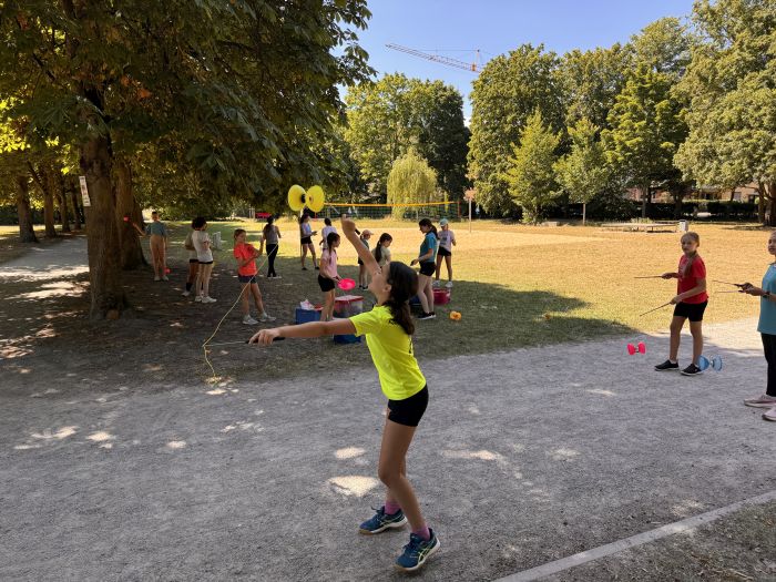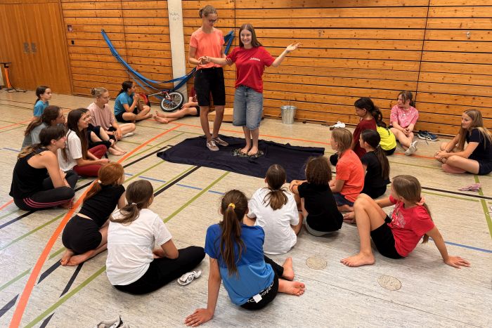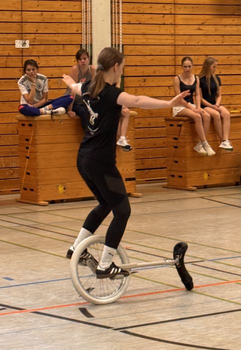 Im Bereich des Einradfahrens unterstützten uns mit Meike und Lara zwei, trotz ihres jungen Alters, äußerst erfahrene Einradtrainerinnen des TSV Dudenhofen, die sogar schon an Weltmeisterschaften im Einrad Freestyle teilgenommen hatten. Zuerst beeindruckten sie unsere Zirkuskünstlerinnen und Zirkuskünstler mit einer kleinen Kostprobe ihres Könnens. Dann leiteten sie, in zwei Gruppen getrennt, unsere Einradanfängerinnen und die Fortgeschrittenen beim Einradfahren an, sodass alle ihre Fertigkeiten verbessern und neue Tricks, wie das Radlaufen und das Fahren ohne Sattel, erlernen konnten. Spaß machten auch die verschiedenen Einradspiele.