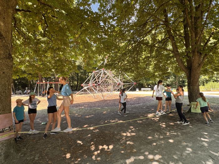 Ein Teil des Workshops fand draußen statt. Auf der Großmutterwiese erprobten alle das Balancieren auf der Slackline bzw. Schlappleine. Außerdem erfreuten sich alle der Bewegung auf der schattigen Wiese und den verschiedenen Spielgeräten.