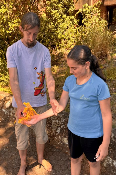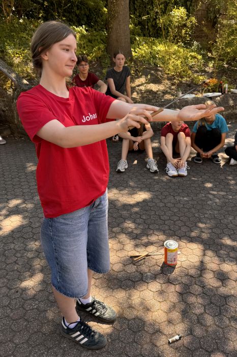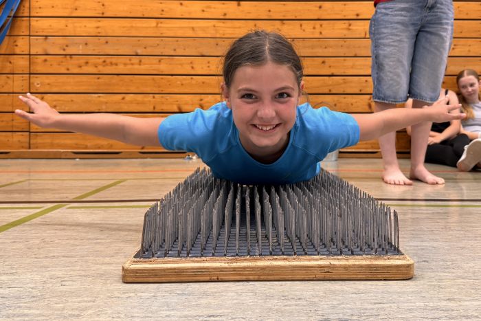 Unsere Schülerin Johanna, die auch Teamerin beim Zirkus Namenlos ist, führte die Schülerinnen und Schüler am Samstag in die Fakirkünste ein. Es kostete schon etwas Mut und Überwindung, über das Nagelbrett zu gehen, sich darauf zu setzen oder zu legen oder auf einem Haufen Scherben zu stehen.
