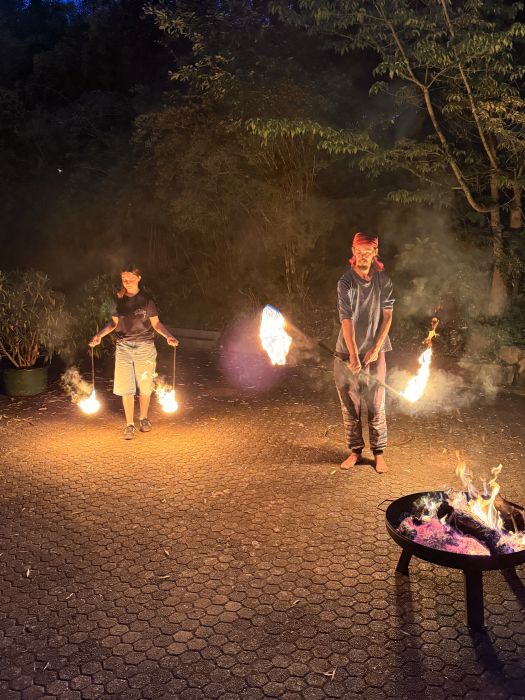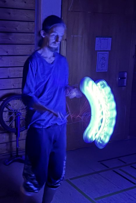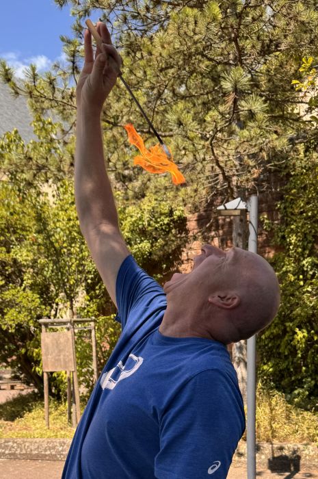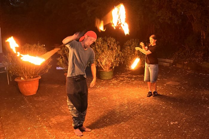 Unsere Bewegungskünstlerinnen und Bewegungskünstler demonstrierten, unter fachgerechter Anleitung, auch beim Umgang mit Feuer, dass sie keine Angst haben. Am Freitagabend zeigten Matze und Johanna bereits eine kleine Feuerjonglage-Show.