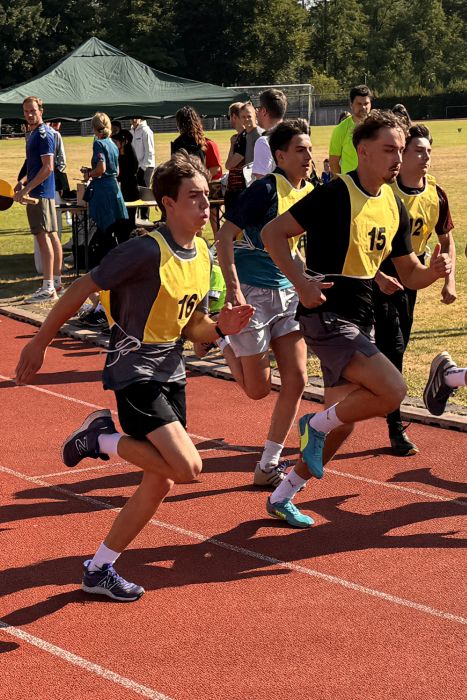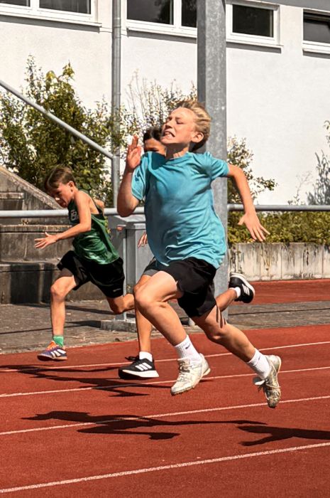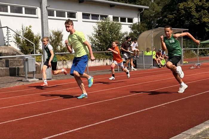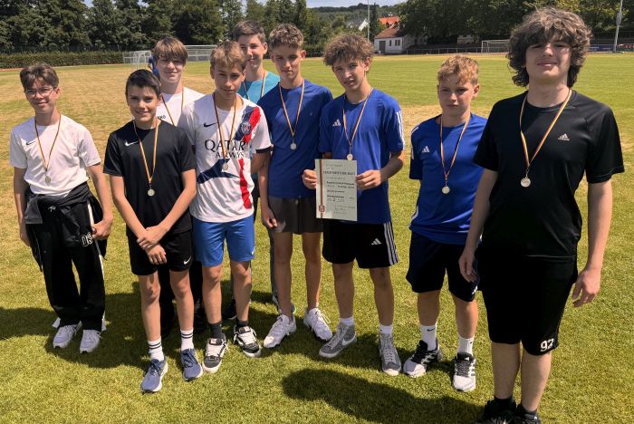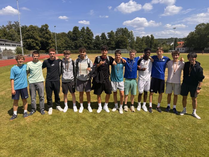 Am Donnerstag, dem 10. Juli 2025, fanden bei bestem Wetter die Stadtmeisterschaften der Jungen in der Leichtathletik statt. Unsere Jungs legten sich kräftig ins Zeug und errangen in der WKII den dritten und in den Wettkampfmannschaften III und IV/1 jeweils den zweiten Platz. Dabei zeigten unsere Sportler tolle Leistungen. Besonders hervorzuheben sind bei den „Großen“ zum Beispiel Julian, der mit seiner Schnellkraft nur 12,15 sec für 100 Meter benötigte und 5,52 m weit sprang, Otto, der die 800 m in 2:26 min schaffte, und Evgeny, der die Kugel auf 9.32 m fliegen ließ. Auch die Staffel war stark. Bei den „Mittleren“ lief Rafael die 800 m in 2:36 min und Thomas stieß die Kugel auf 8,96 m. Moritz schrieb sich mit seinem Sprung auf 5,27 m in die „ewige“ Bestenliste des Dalbergs ein und sprintete, zeitgleich mit Tom, die 75 m in 9,87 sec. Bei den „Kleinen“ lief Jakob die beste Zeit auf 800 m (2:48 min). Xaver warf den Ball auf 38 m. Und Valentin und Gergö sprangen 4,22 m weit, wobei Letzterer gerade einmal in der 5. Klasse ist. Da können wir nächstes Jahr mit weiteren starken Leistungen rechnen. Eine herausragende Leistung zeigte Alexander beim 50m-Sprint. Mit 6,78 sec ist er der schnellste Dalberger der letzten Dekade auf dieser Strecke. Gratulation!