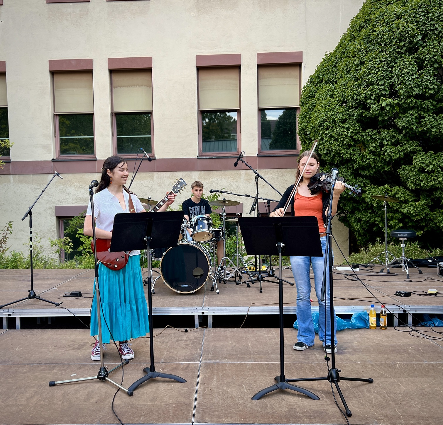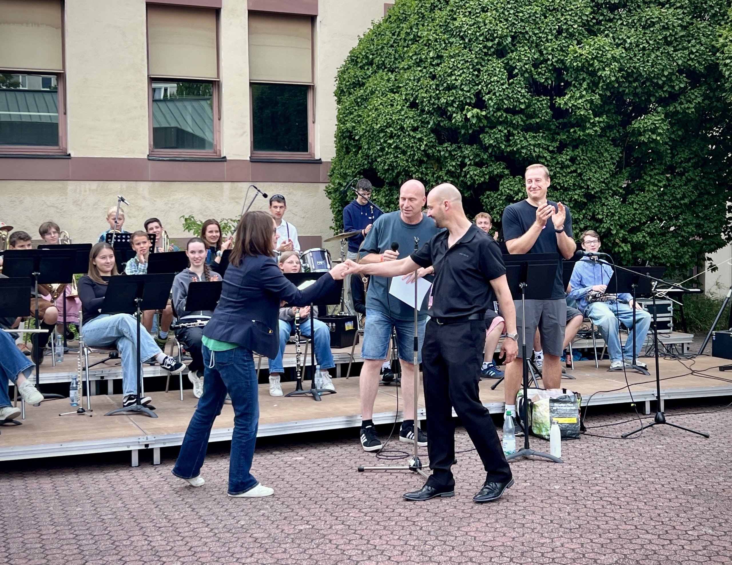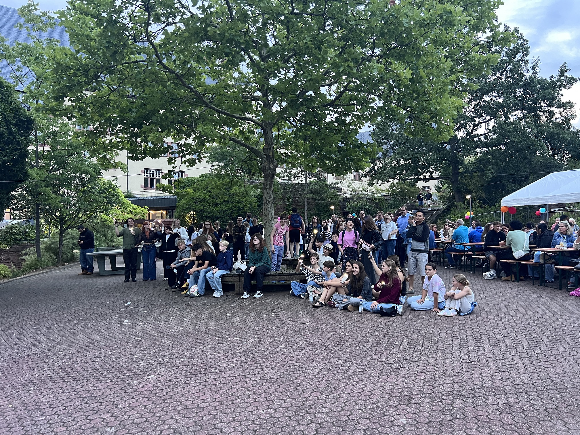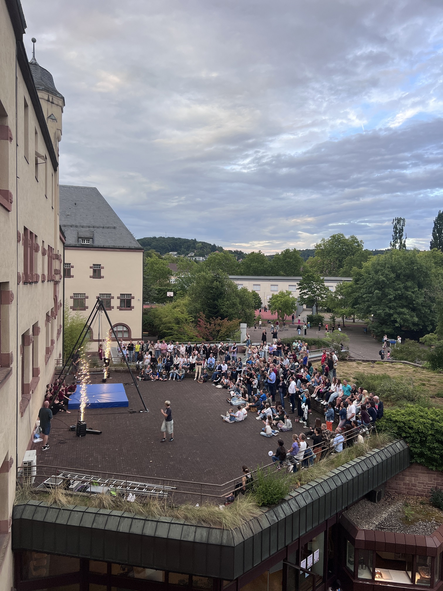 Ab 18.00 Uhr öffnete sich das Schulfest auch für Ehemalige und Freunde des Dalberg-Gymnasiums. Auf dem Pausenhof bewirtete uns der Elternbeirat. Musikalisch umrahmt wurde der Abend von der Lehrerband, unserer Blaskapelle „Karl-Theodors Böhmische“ und Schülerbands.