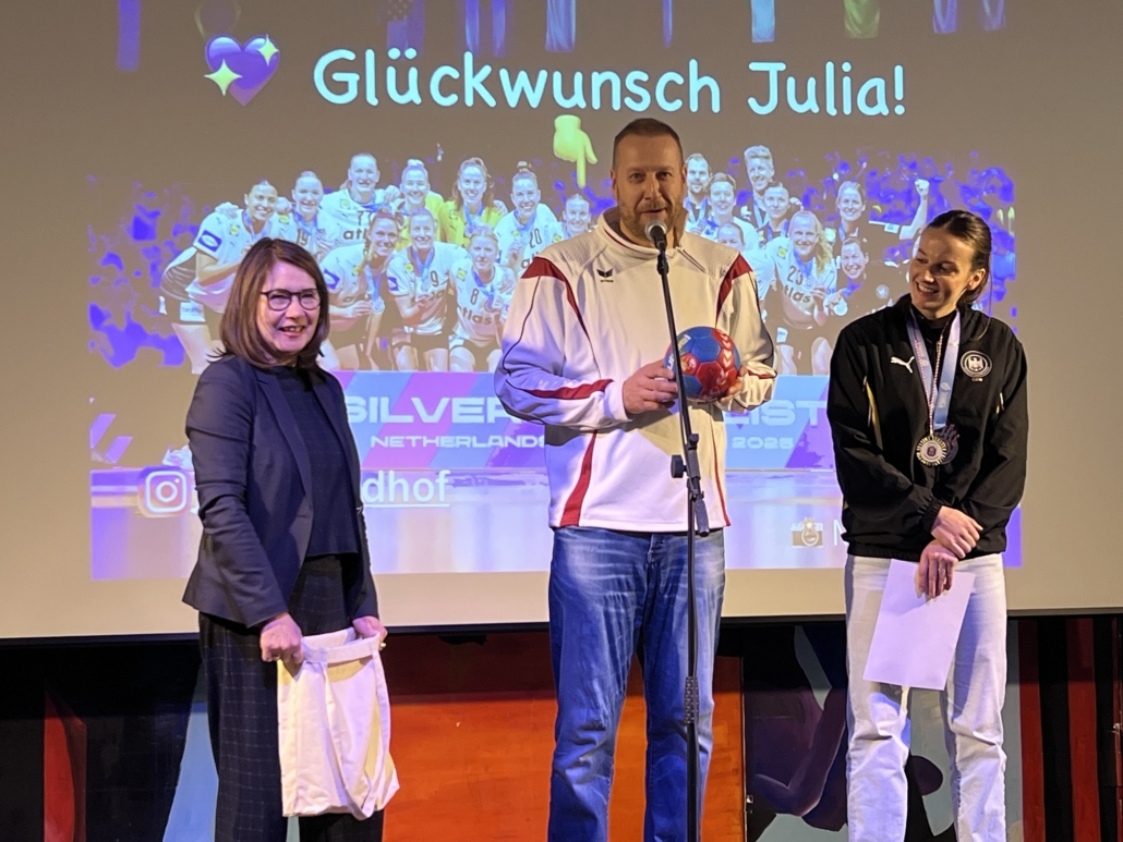 Unter tosendem Applaus begrüßte Schulleiterin Barbara Rank-Lorz die DHB-Spielerin in der voll besetzten Aula. In ihrer Ansprache ließ sie einige Meilensteine aus Julias noch immer andauernder, beeindruckender Karriere Revue passieren:
