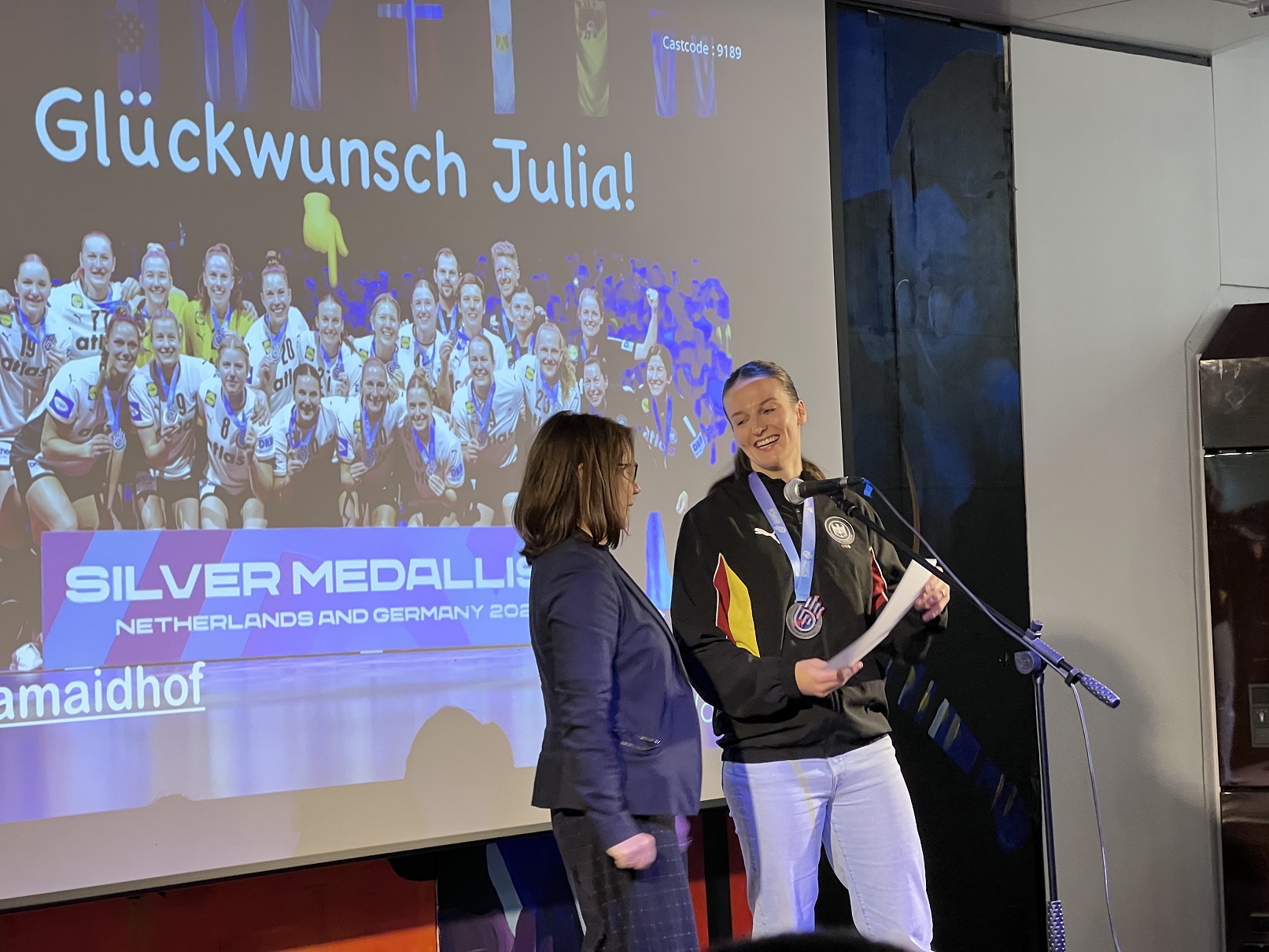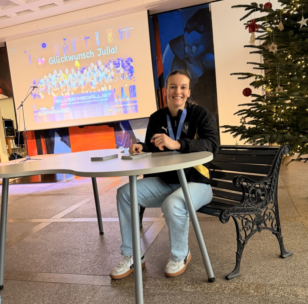 Noch am vergangenen Sonntag stand Julia im WM-Finale in Rotterdam auf dem Spielfeld, nur wenige Tage später – am darauffolgenden Freitag – schlenderte sie mit der Silbermedaille um den Hals durch die Gänge ihrer ehemaligen Schule. Von 2008 bis 2016 besuchte sie das Dalberg-Gymnasium und schaffte es bereits in jungen Jahren eindrucksvoll, schulische Anforderungen und Leistungssport miteinander zu vereinen.