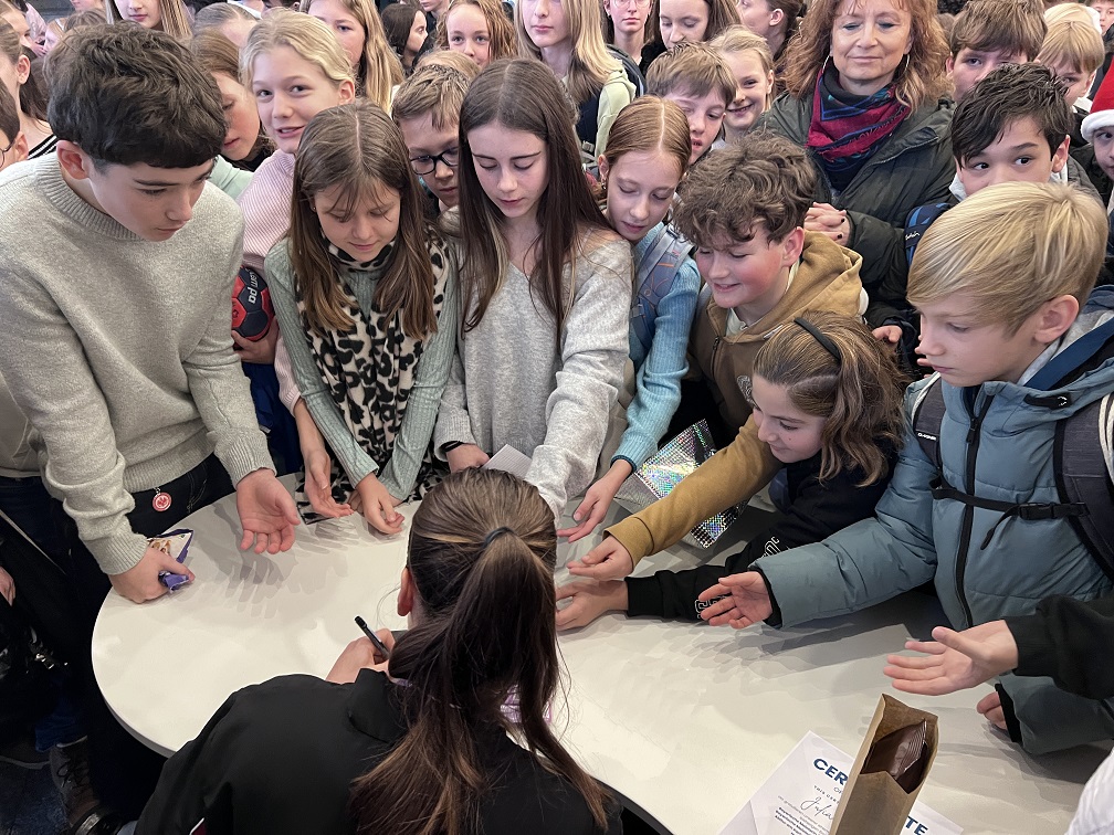 Im Anschluss hatten die Schülerinnen und Schüler die Gelegenheit, Autogramme zu sammeln, Fragen zu stellen und der Vizeweltmeisterin ganz persönlich zu begegnen. Die gesamte Schulfamilie zeigte sich begeistert von Julias offener, authentischer und nahbarer Art.