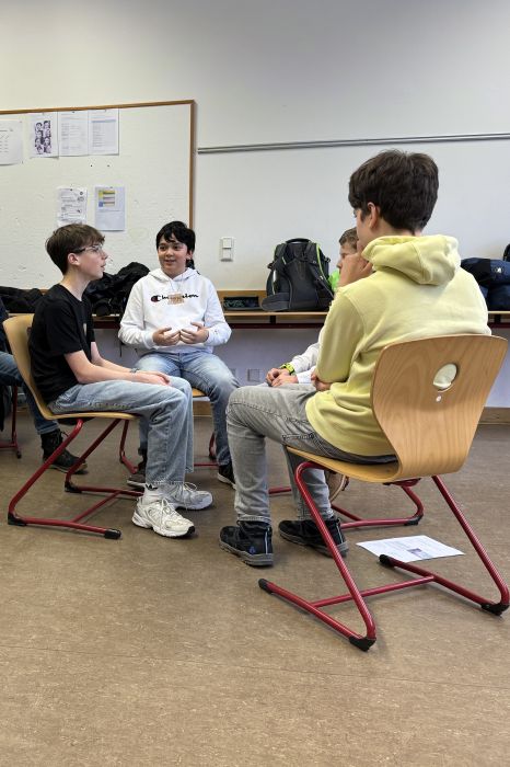 Schließlich wurden die Erkenntnisse aus dem Projekt auch auf die eigene Klasse übertragen. Hier wurde eingeübt, wie man gut mit Konflikten umgehen und sie so lösen kann, dass Wasser und nicht Benzin ins Feuer gekippt wird. Hier helfen zum Beispiel so genannte Ich-Botschaften und die Formulierung von Tatsachen, ohne das Gegenüber anzugreifen. Die Klassen machten sich auch noch einmal bewusst, welche Regeln in einer Klasse eingehalten werden sollten, sodass sich jeder wohl fühlt und auch gut lernen kann.