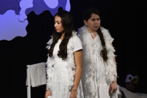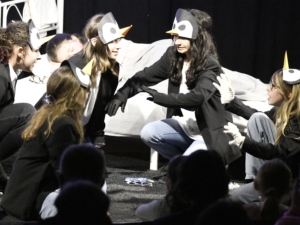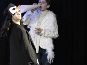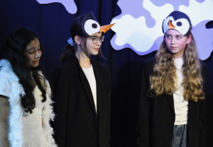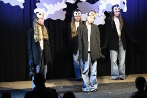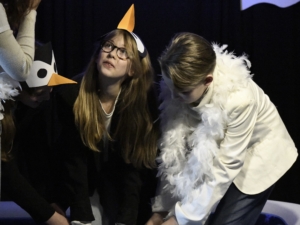 In den beiden Aufführungen am 6. und 7. März unter Leitung von Johannes Lorentzen wurden gleich mehrere Geschichten rund um die Themen Flucht und Ankommen auf die Bühne gebracht: Von Nyaboth, die als junges Mädchen mit ihrer Mutter und ihrer Zwillingsschwester vom Sudan nach Äthiopien flüchten musste, auch nachzulesen auf der Webseite des UNHCR. Von so manchen Gegenständen, die die Flüchtenden auf ihrer gefährlichen Reise begleiten; was würden sie uns berichten, wenn sie sprechen könnten? Und natürlich von den Pinguinen bei ihrem tragikomischen Versuch, einander nicht im Regen stehen zu lassen.