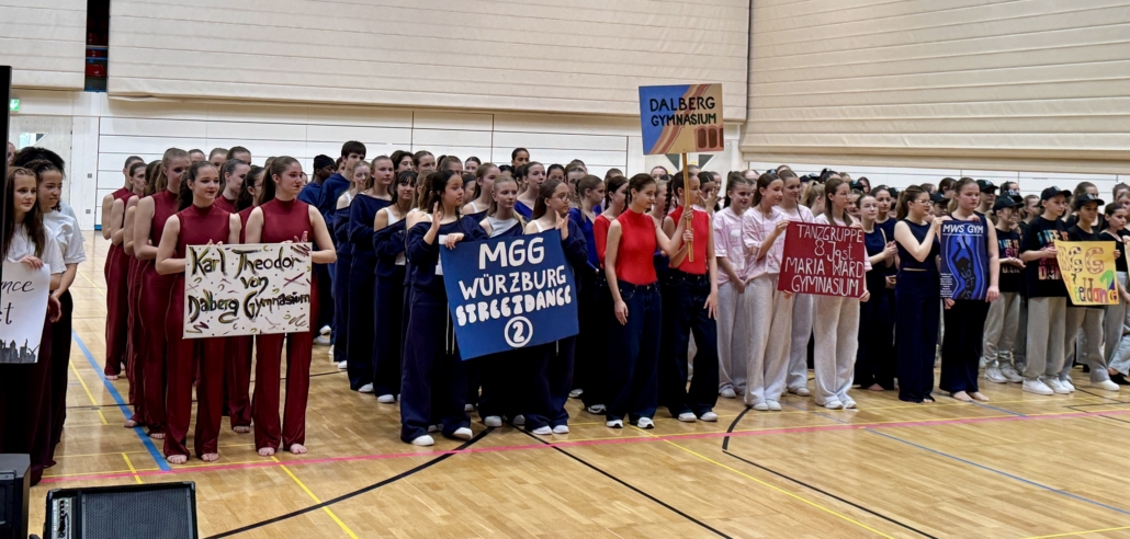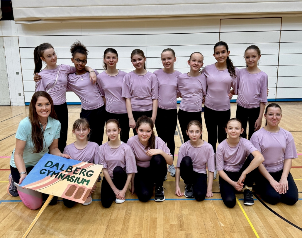 Mit gleich drei Teams ist unsere Schule in diesem Jahr bei den Unterfränkischen Bezirksmeisterschaften im Tanz angetreten, die erneut hier bei uns in Aschaffenburg ausgerichtet wurden. Zahlreiche Schülerinnen und Schüler, Eltern und sogar unsere Schulleiterin Frau Rank-Lorz waren am Wettkampftag in die Linde MH Arena gekommen, um von der Tribüne aus die Dalberg-Tänzerinnen anzufeuern: Bei insgesamt 15 Teams im Wettbewerb knisterte es ordentlich zwischen den einzelnen Nummern des insgesamt hoch spannenden Programmes. Unsere Tänzerinnen haben alle tolle Performances abgeliefert, die in der Gesamtwertung schließlich mit einem 1., 3. und 5. Platz belohnt wurden.