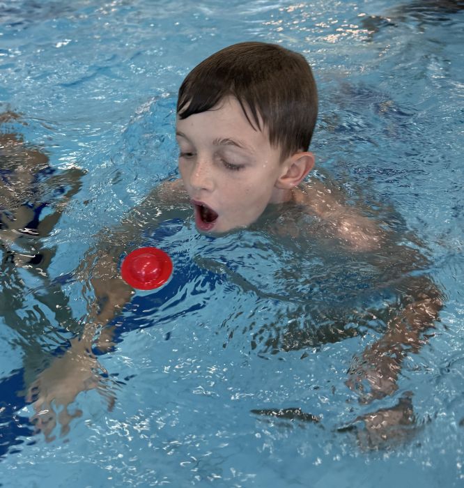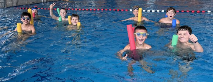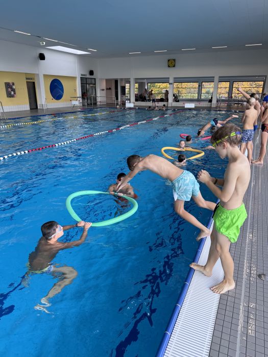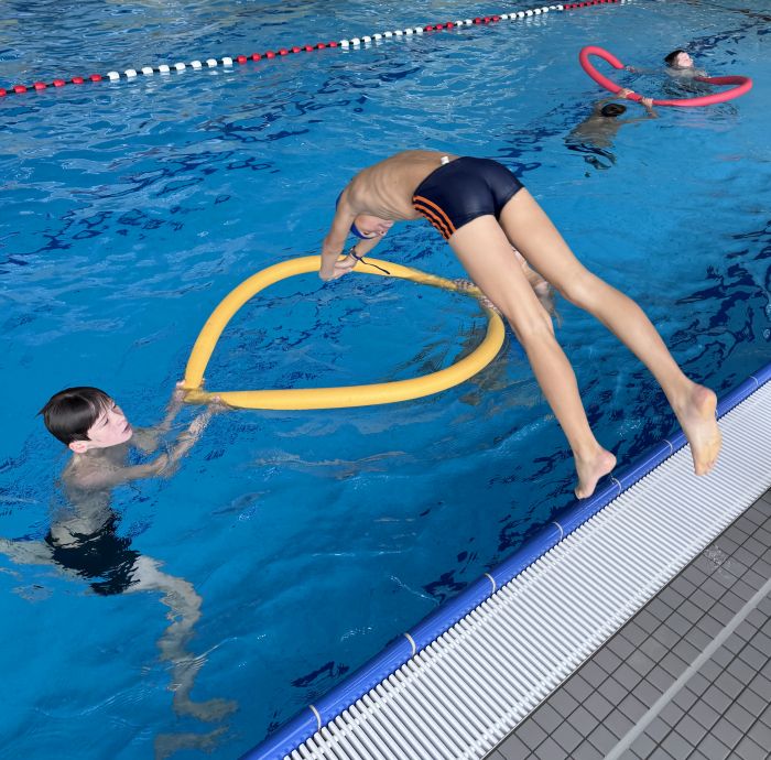 Im Schwimm-Unterricht übten die Jungen der Klassen 5a, 5b und 5f den Kopfsprung – das Verriegeln der Hände, das Verschließen der Ohren mit den Schultern, das Abstoßen von der Beckenkante, das Schlüpfen durch ein Loch in der Wasseroberfläche, das Strecken der Zehen und das lange Gleiten. Zuvor machten die Jungs verschiedene Tauchspiele und lernten, kräftig ins Wasser auszuatmen. Spaß machte auch das Reiten auf den Nudeln.
