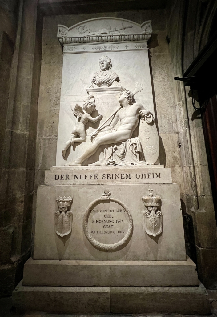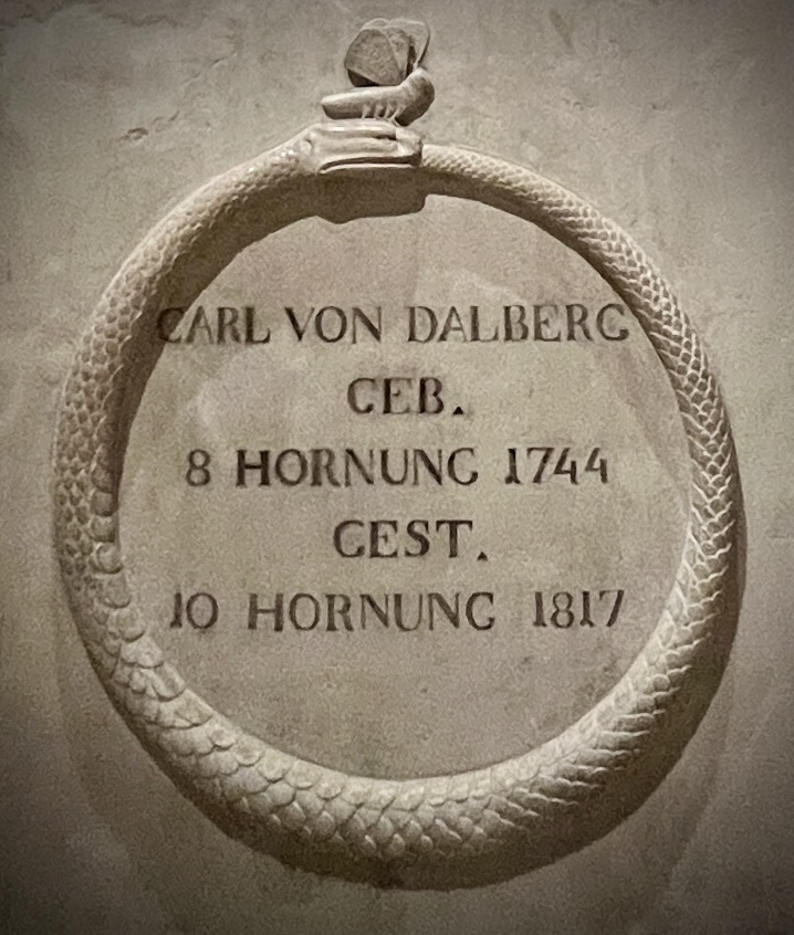 Carl Theodor von Dalberg verstarb 1817 in Regensburg und wurde im dortigen Dom beigesetzt. Sein Herz wurde in die Stiftskirche nach Aschaffenburg überführt.