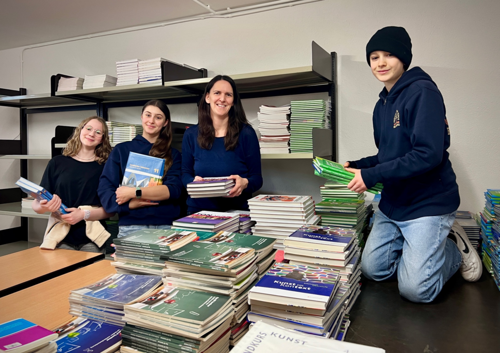 Nach Abschluss der Renovierungsarbeiten ziehen die Lehrbücher unter tatkräftiger Hilfe einiger Schülerinnen und Schüler aus der 8. Jahrgangsstufe wieder in ihr angestammtes Domizil.