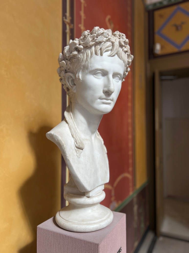 Kopie der Portraitbüste des Augustus, sog. Augustus Bevilacqua, im Pompejanum und im Büro der Schulleiterin am Dalberg-Gymnasium. Das Original steht in der Glyptothek in München.