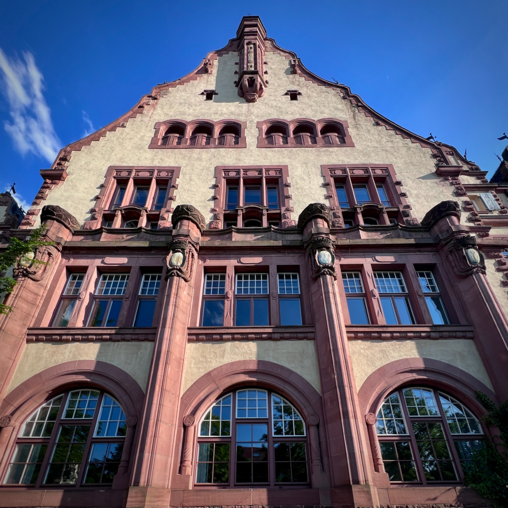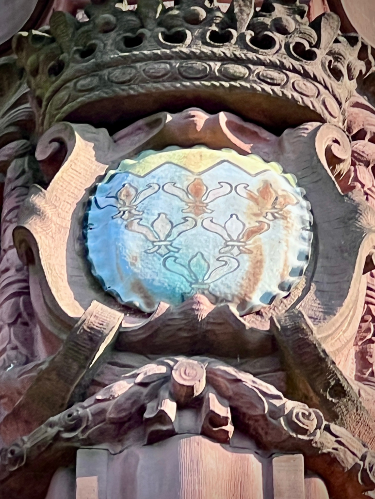 Ihr ursprüngliches Wappen (unter einem mit drei Spitzen abgeteilten goldenen Schildhaupt auf blauem Grund 6 silberne Lilien) ziert die Fassade des Dalberg-Gymnasiums.
