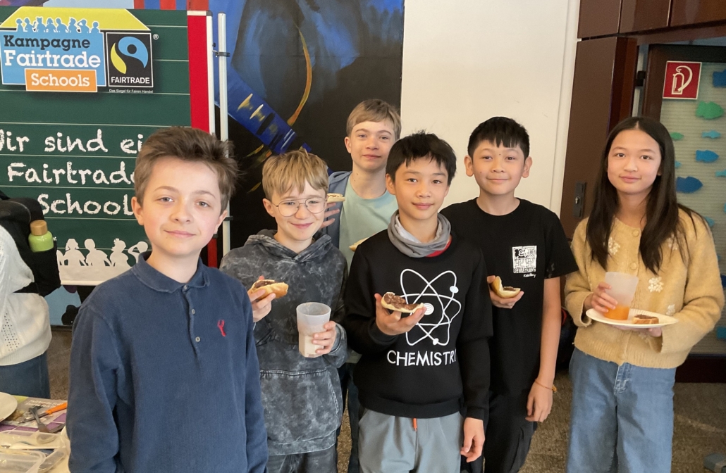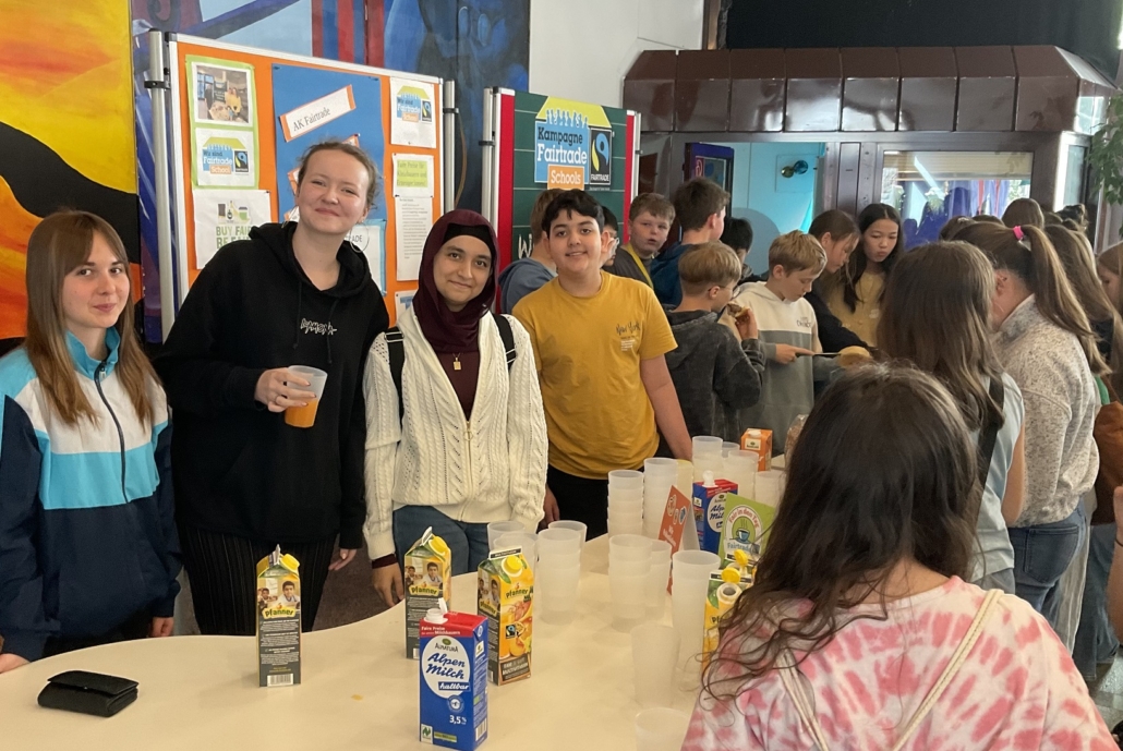 Unsere 6. Klassen waren am vergangenen Donnerstag in den beiden Pausen zu einem fairen und leckeren Frühstück eingeladen. Der AK Fairtrade führte diese Aktion durch, um die reiche Auswahl an Produkten vorzustellen, mit denen man ein Frühstück fair gestalten kann: Wir konnten u.a. faires Schokomüsli, faire Fruchtsäfte, eine faire Nuss-Nougat-Creme und faire Bananen anbieten. Auch bei der verwendeten Milch achteten wir darauf, dass die Landwirte für ihre Arbeit einen fairen Lohn erhalten.
