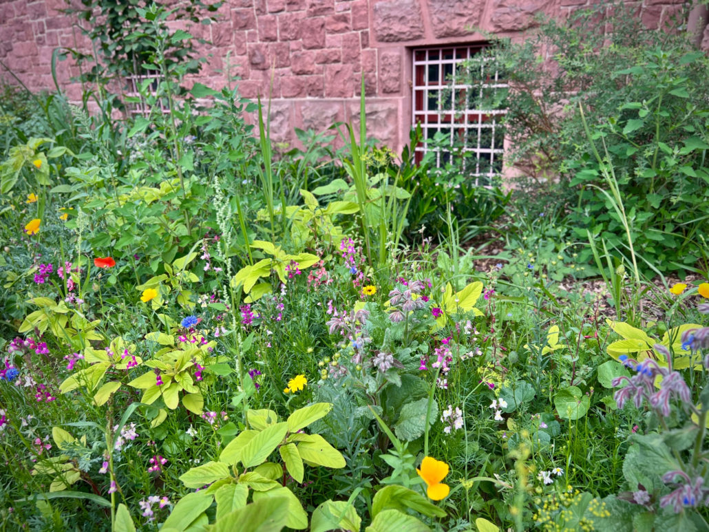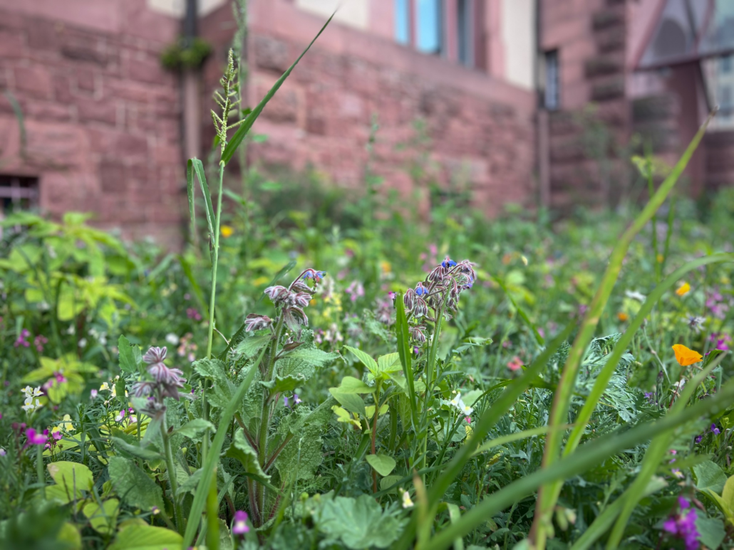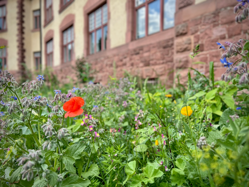 bunte Blumen vor dem Hauptgebäude