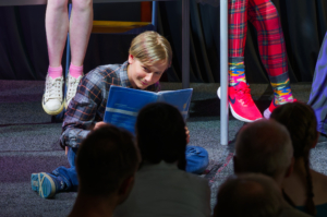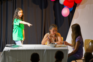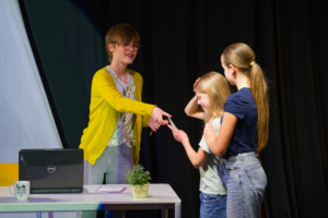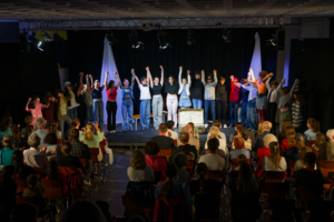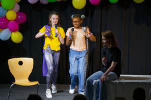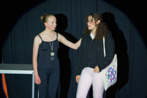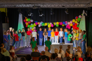 Das gelang auch der Theatergruppe Unterstufe unter der Leitung von Johannes Lorentzen, die ebenfalls am 4. und 5. Juni 2025 in der Aula ihre Collage „Gemischte Gefühle“ zur Aufführung brachte. Die 32 Schülerinnen und Schüler widmeten sich darin ganz unterschiedlichen Emotionen, die uns durch unser Leben begleiten: Wie umgehen mit Liebeskummer? Wie viele Liter Tränen vergießt ein Mensch in seinem Leben? Warum sind Emotionen schneller als unser Verstand? Oder: Haben Bakterien eigentlich auch Gefühle?