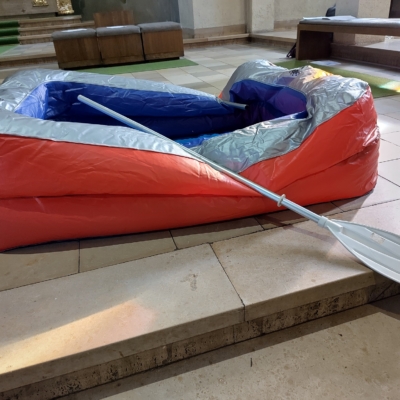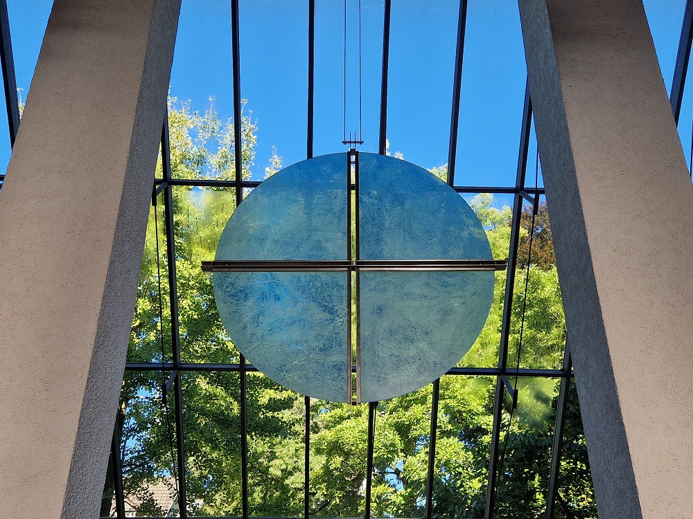 Thema war „Das Reich Gottes ist mitten unter uns“ mit dem blauen Kreuz über dem Altar im Fokus.